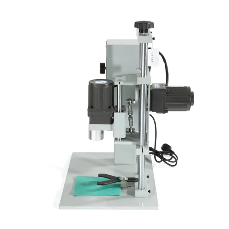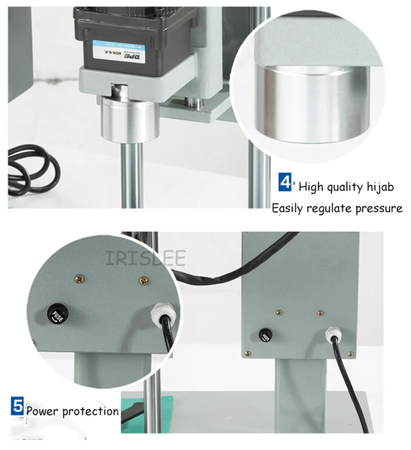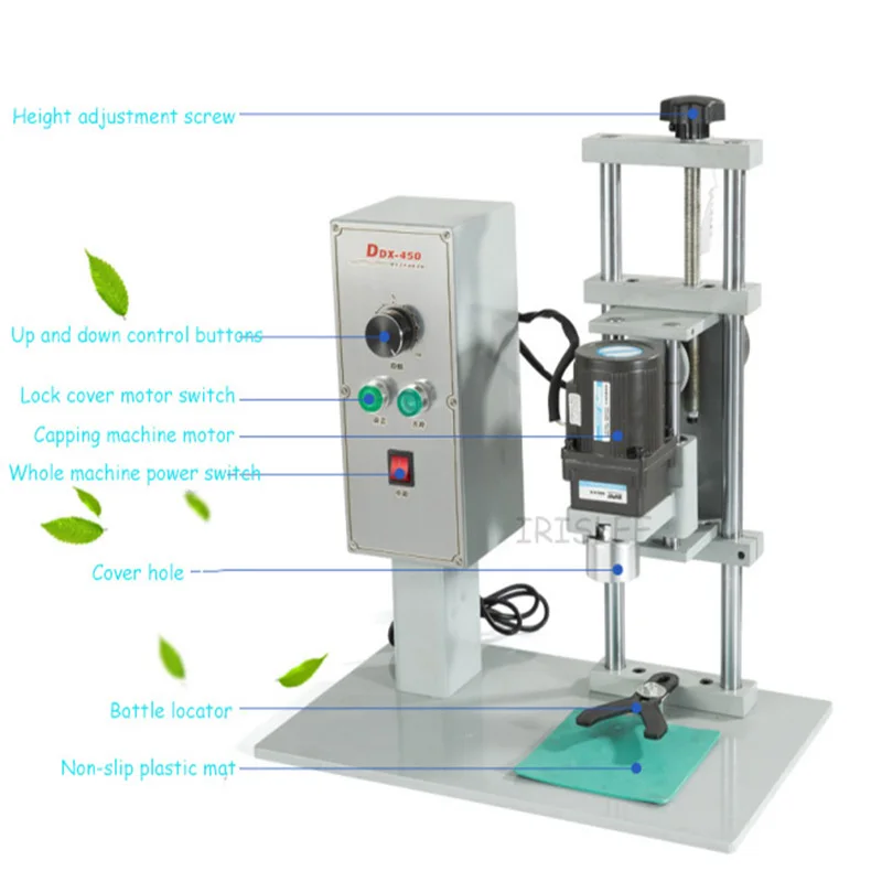 Name: Desktop Electric Capping Machine Device model: DDX-450 Power supply: 220V50HZ Rated power: 50W Cap diameter: 10-50mm Production capacity: 20-40 / min Use bottle height: 40-370MM Machine size: 520 * 300 * 530mm Material: Stainless steel Net weight: 23KG