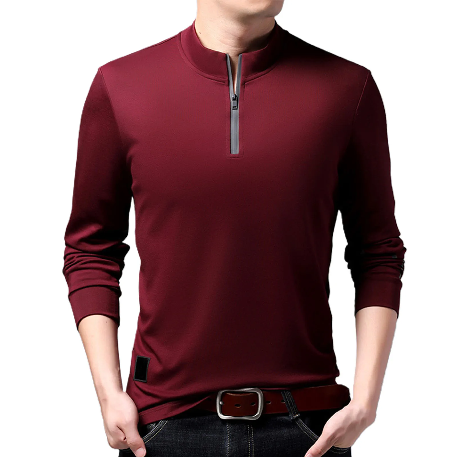 Модная мужская Осенняя однотонная блузка на молнии с длинным рукавом и воротником-стойкой