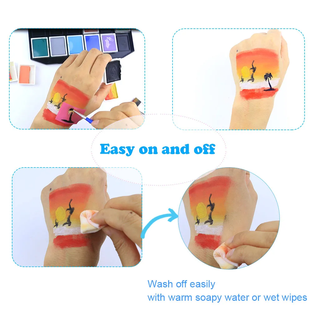 Так как набор для нанесения краски для тела и лица Bowitzki основан на воде, его можно легко использовать с водой, быстро сохнет в течение нескольких минут. Можно легко смывать теплой мыльной водой или влажными салфетками. Перед покраской вы можете использовать крем для лица или лосьон для тела на вашей коже, что позволит легко удалить краски.