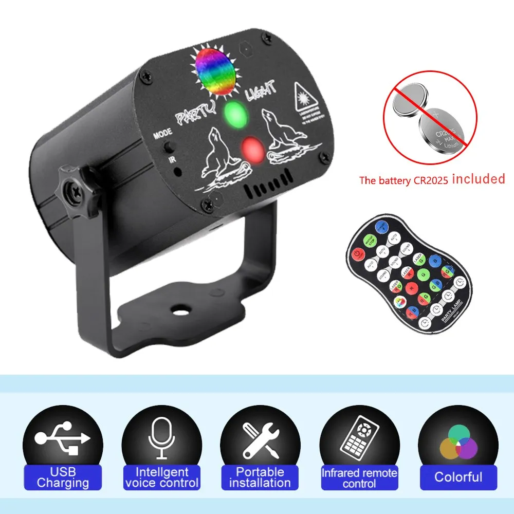 * IR remote,Compared with other portable stage lights, our cordless laser lights are designed with voice-activated mode or intelligent mode, you can easily switch between the two modes by pressing the button. the remote control power by 2*CR2025 battery