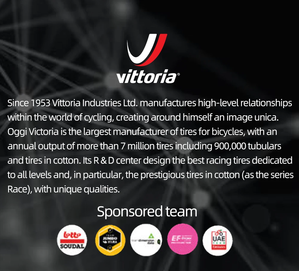 С 1953 года Vittoria Industries ltd. Производит высококачественные отношения в мире езды на велосипеде, создавая вокруг себя образ unica. Высокопроизводительный производитель шин для велосипедов с годовым объемом производства более 7 миллионов шин, включая 900000 тубулар и шины из хлопка. Его центр НИОКР проектирует лучшие гоночные шины, предназначенные для всех уровней и, в частности, престижные шины из хлопка (как серии Race), с уникальными качествами.