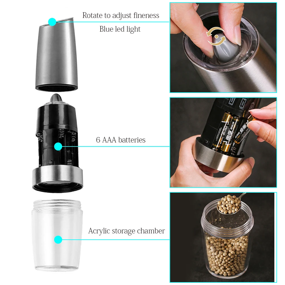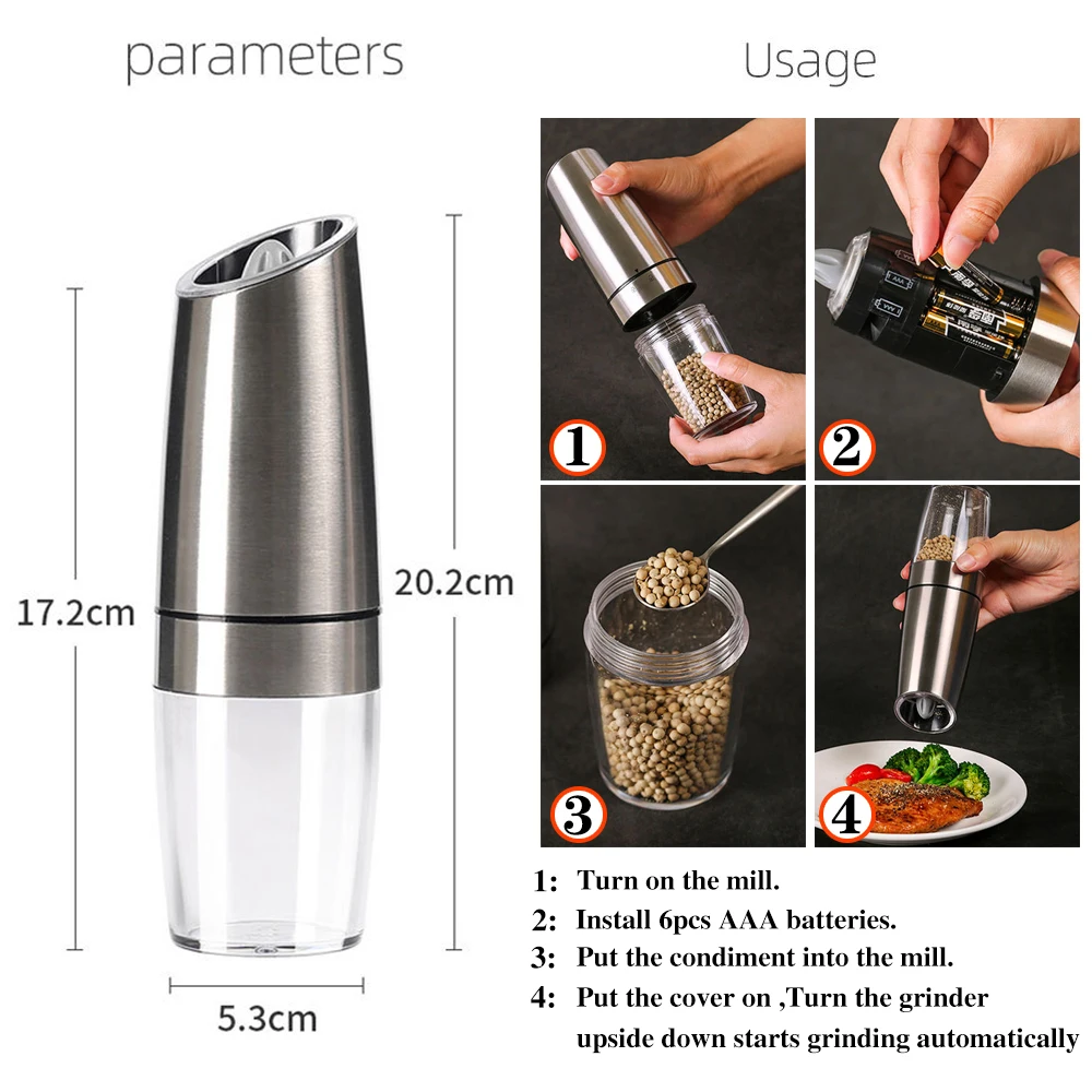 Электрическая автоматическая мельница для специй, для перца и соли, мельница со светодиодной подсветкой, зернистая мельница, фарфоровая мельница для помола, кухонные инструменты Наименование товара: электрическая мельница для соли и перца Материал: нержавеющая сталь акрил Procelain шлифовальный сердечник ABS Цвет: черный (ABS) и серебристый (нержавеющая сталь) Размер: длина 20,8 см (8 дюймов), диаметр около 6 см Вес нетто: черная мельница составляет около 300 г, нержавеющая сталь 340 г Емкость: около 120 мл, может держать 60-70 г перца Батарея: 6 шт. AAA батареи (не включены в нашу посылка) 【Современный дизайн и супер ценность 】 простой и модный дизайн, подходит для всех обеденных столов и кухонных столешниц. 【Регулируемая шлифовальная грубость 】наша мельница для соли или перца оснащена высококачественной керамической шлифовальной машиной, которая поддерживает различные настройки измельчения грубости, вы можете выбрать грубость, поворачивая регулируемую ручку, от тонкой до грубой. Удовлетворите любые специи и любую грубость, которую вы хотите. 【Премиум качество и большая емкость 】 изготовлен из высококачественной нержавеющей стали, эта мельница для соли и перца допускается для широкого спектра кулинарных применений, сохраняя специи свежими и здоровыми. 100 мл большая емкость для хранения легко моется и не нужно часто заправлять. 【Легко использовать 】нет необходимости ручного шлифования, нет кнопок для нажатия. Просто Наклоните, чтобы автоматически активировать мельница для специй перца мельницы. Синий светодиодный источник питания четко освещает, когда шейкер для перца начинает работать, предотвращая чрезмерное ароматизирование пищи. 💢Посылка: Без аккумулятора