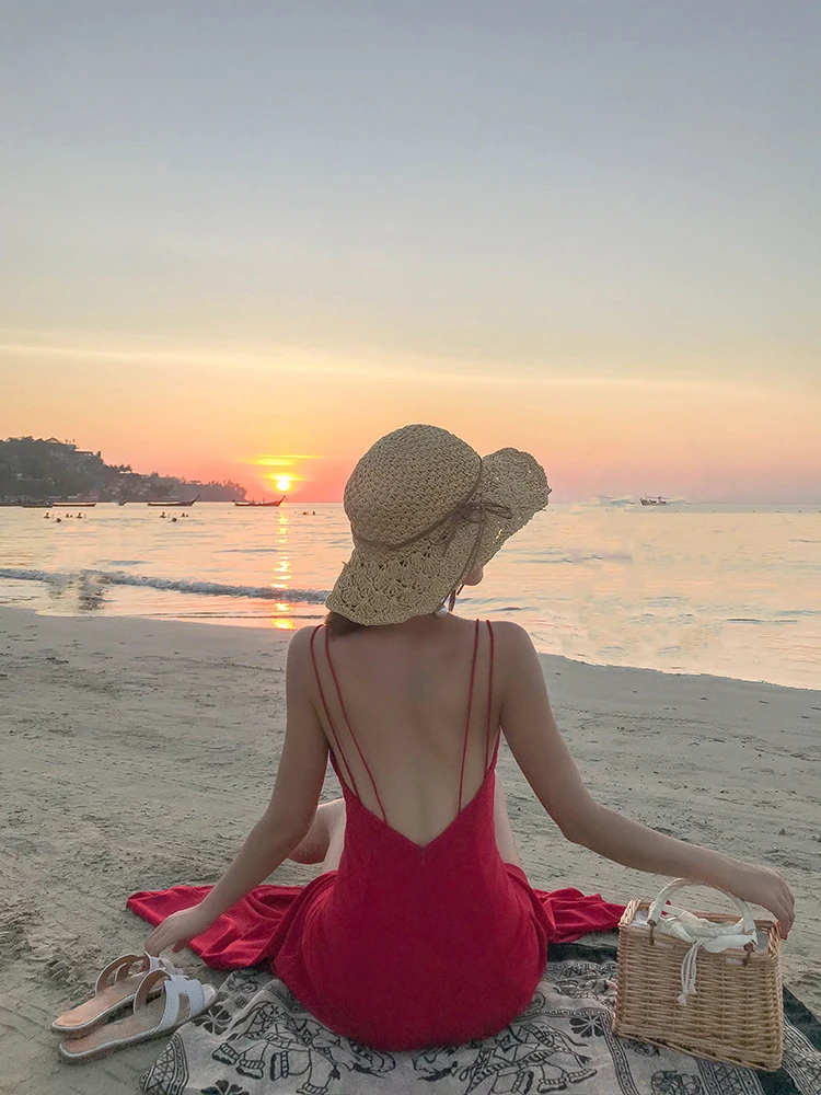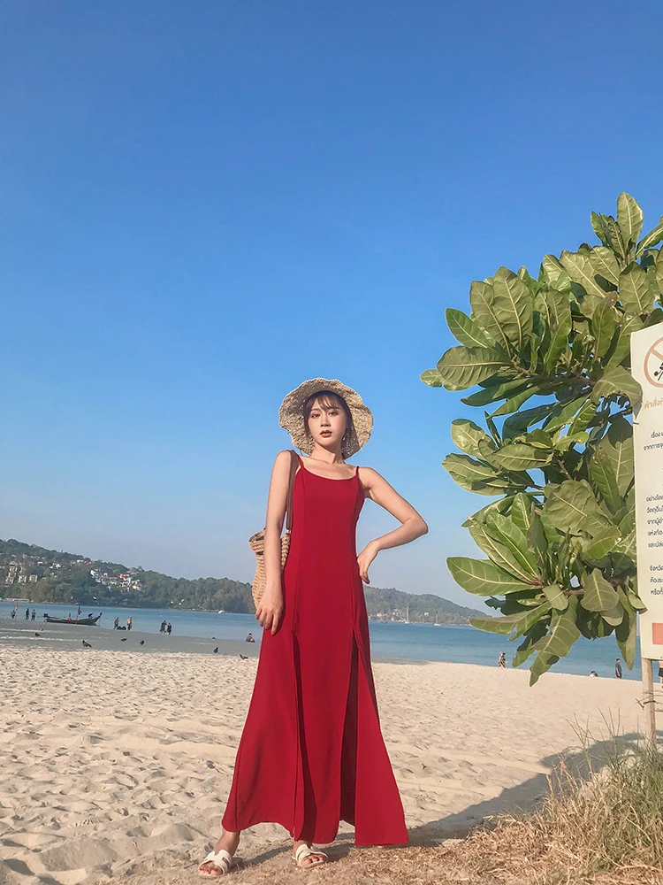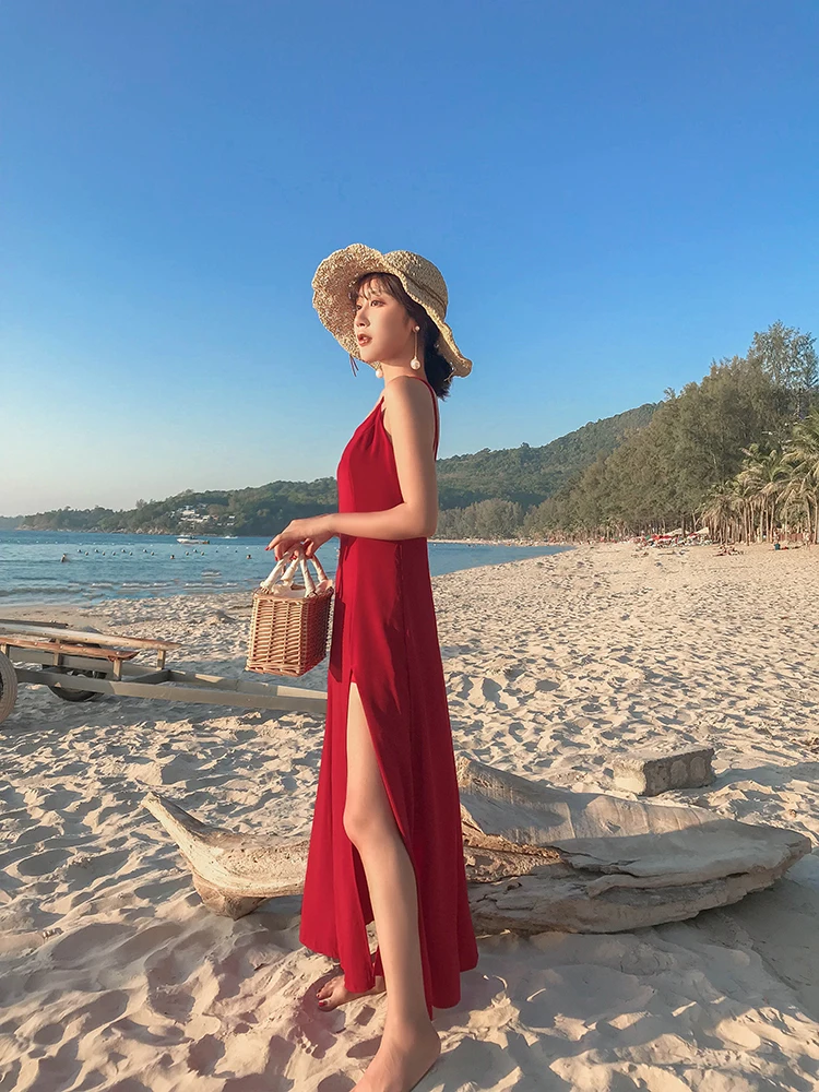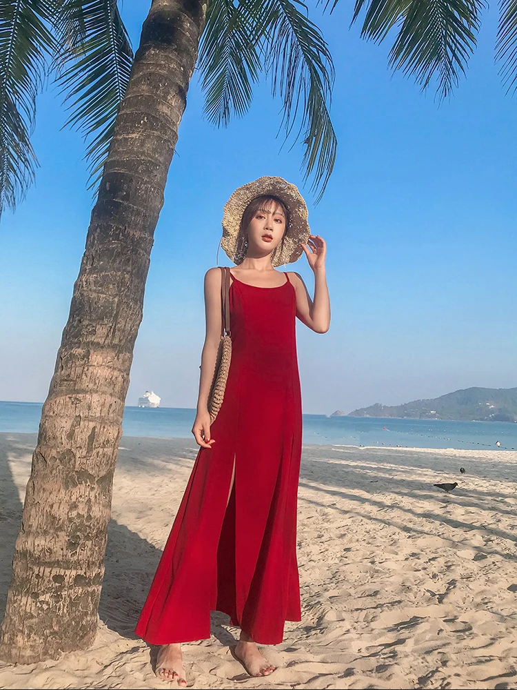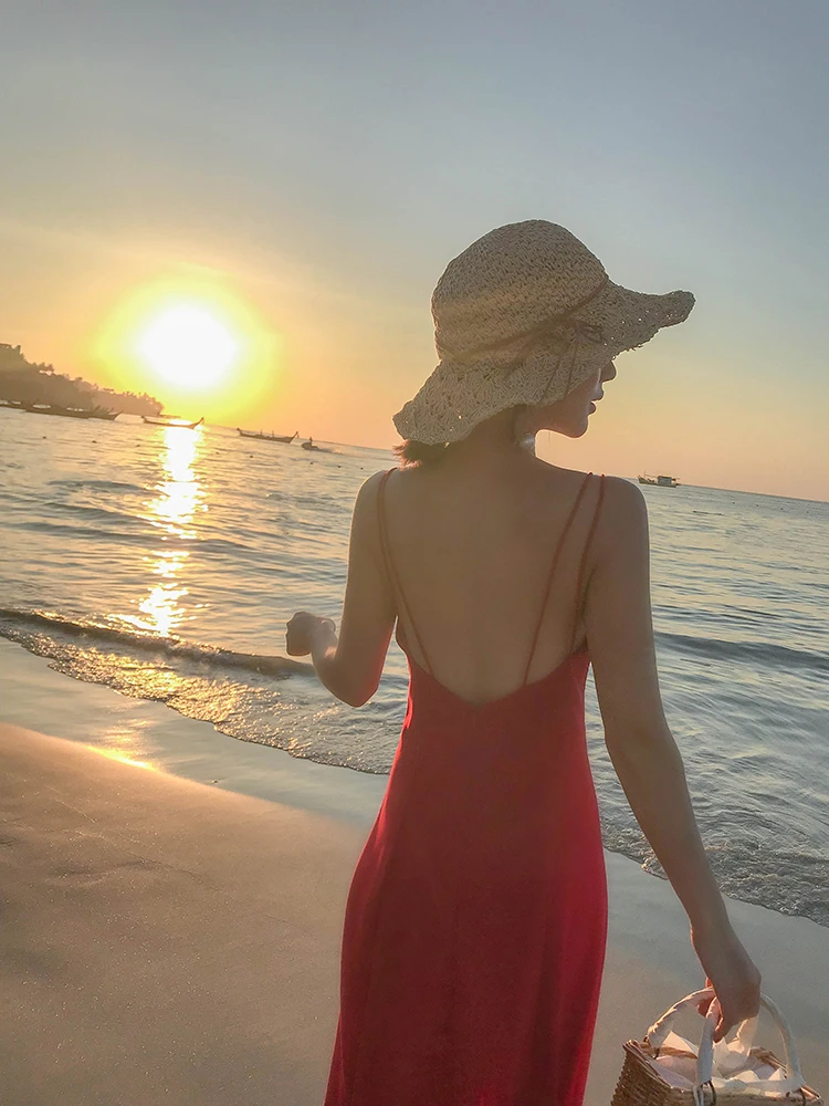 Женское пляжное платье-комбинация TingYiLi, винно-Красное длинное платье в стиле бохо с открытой спиной на лето