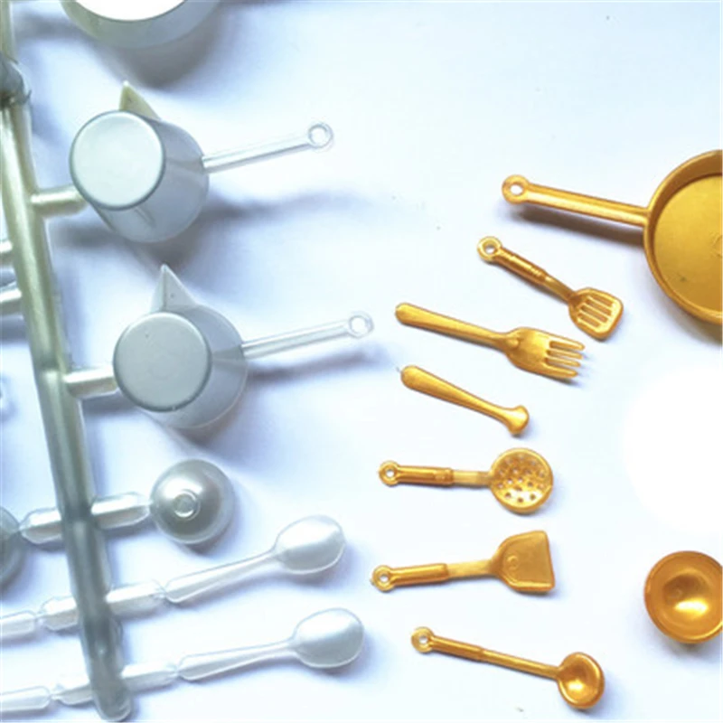 description: Baby size as the picture shows Weight: 8g material: plastic Mini pot for dollhouse kitchen Suitable for 1:12 doll house Package includes: mini soup pot, frying pan, water rinse, bowl, knife and fork, soup spoon, spatula, colander, etc. 10pcs