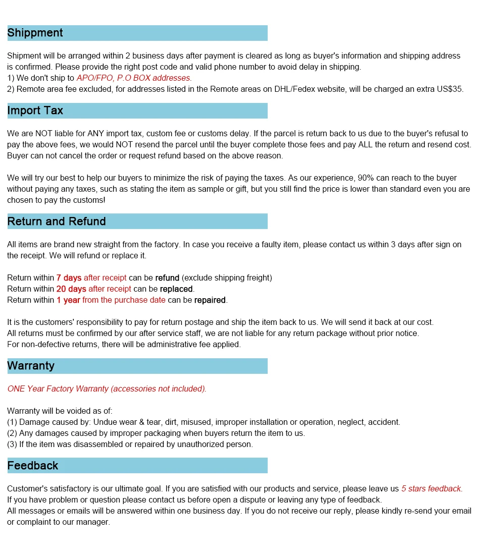 2. Если ваш регион принадлежит DHL удаленной области, то покупатель должен добавить 35 долларов США в качестве платы за удаленную доставку, взимаемой DHL.