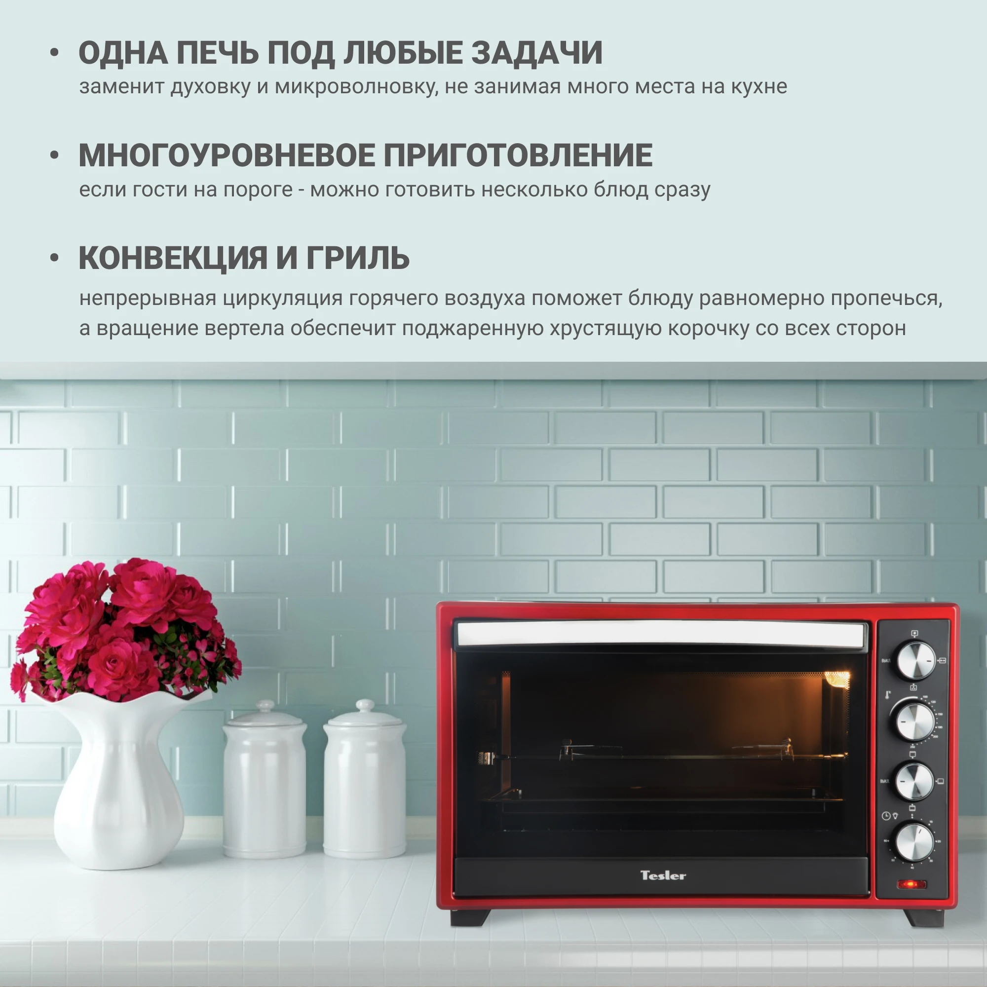 Мини-печь Tesler EOGС-5550 - практичная и изящная, с простым механическим управлением. Фронтальная рамка вишнего цвета выгодно контрастирует с черным матовым корпусом, выполненным из прочного металла.
