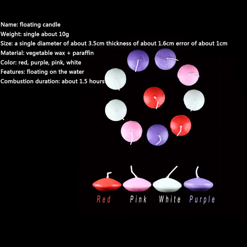 100% новый и высококачественный Материал:Парафиновый воск Цвет: белый, розовый, красный, фиолетовый Размер: одинарный диаметр 1,6 см, толщина см Преобразование: 1 дюйм = 2,54 см, 1 см = 0,393 дюйма Посылка10 шт./пакет плавающих свечей Номер товара: 881916-881919 Полезный совет: Напоминаем, что из-за световых эффектов, настроек яркости и контрастности мониторов и прочих факторов могут наблюдаться некоторые отличия в цвете между фотографией на сайте и самим товаром. Измерения проводятся вручную; возможна погрешность в 1 см; благодарим за понимание.