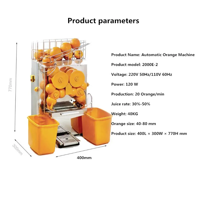Название продукта: Автоматическая оранжевая машина Модель продукта: 2000E-2 Напряжение: 220 В, 50 Гц/110 В, 60 Гц Мощность: 120 Вт Производство: 20 Оранжевый/мин Скорость сока: 30%-50% Вес: 40 кг Оранжевый Размер: 40-80 мм Размер продукта: 400L × 300W × 770H мм Тип обработанной пищи: подходит для извлечения апельсинового сока