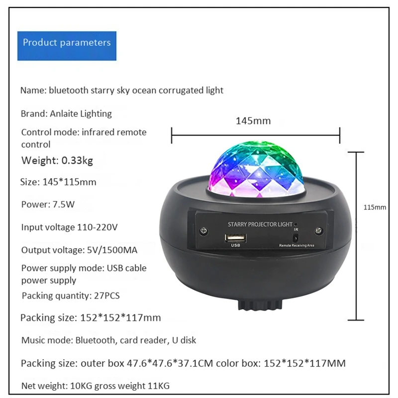 Звездный проектор с дистанционным управлением, Звездный проектор с высоким разрешением и волновой проектор могут проецировать полностью звездное ночное небо на стены и потолок.