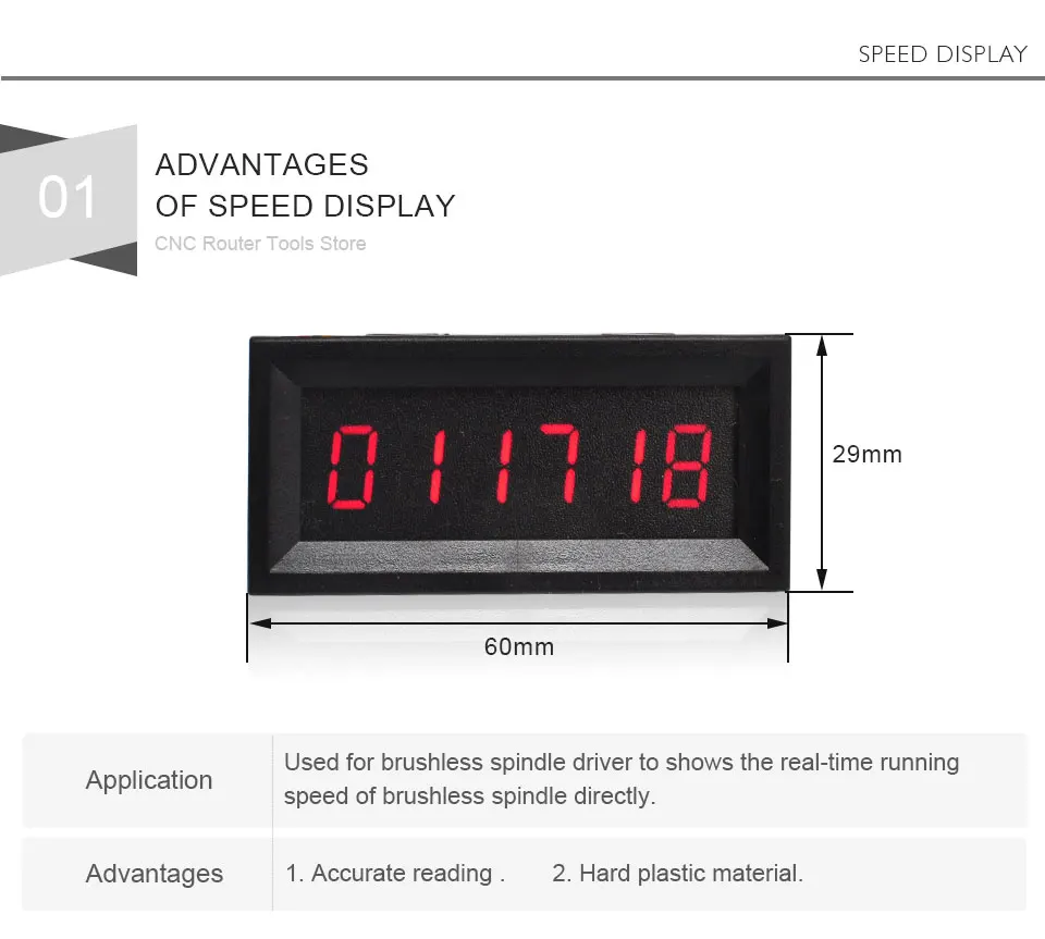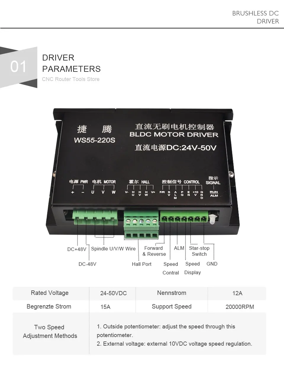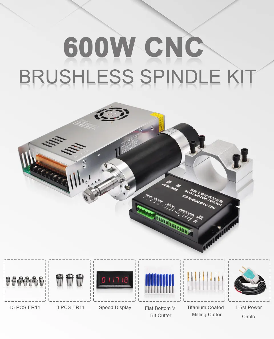 Характеристики: Мощность: 600 Вт Напряжение: 48 В постоянного тока Зажим: 55 мм Цанга: ER11 Частота: 0-400 Гц Скорость: 0-9000 об/мин Использование: гравировка камней, дерева, стали и т. Д.
