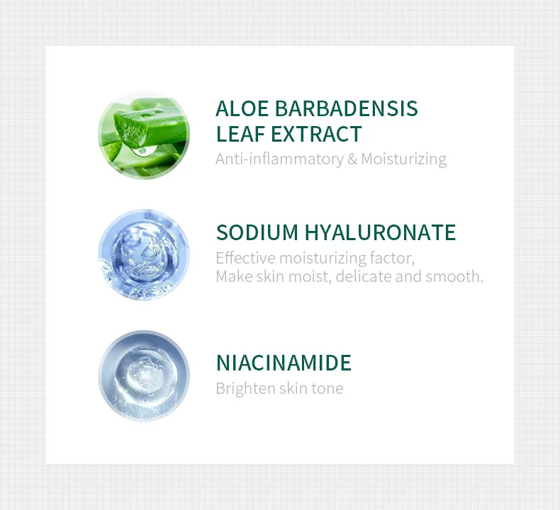 1. Экстракт CENTELLA ASIATICA-успокаивающий и восстанавливающий Он оказывает замечательное влияние на восстановление после солнечных ожогов, стимулируя выработку коллагена кожи, повышая эластичность кожи и замедляя старение кожи. 2. Экстракт листьев алоэ BARBADENSIS-противовоспалительный и увлажняющий 3. Гиалуронат натрия-эффективный увлажняющий фактор, делает кожу влажной, нежной и гладкой. 4. NIACINAMIDE-осветляет тон кожи.