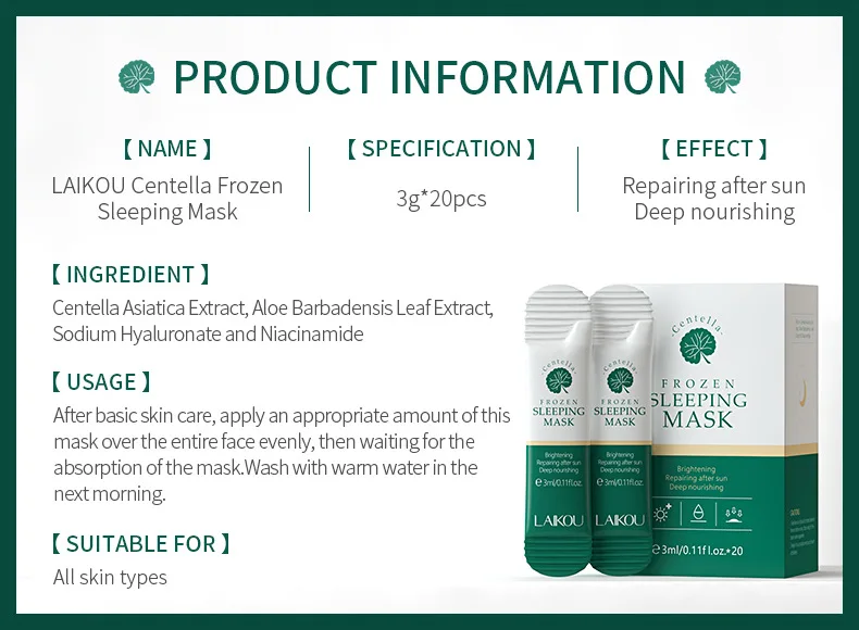 ▶LAIKOU Centella замороженная маска для сна 【SPECIFICATION】 3g * 20 шт 【EFFECT】Repairing после пребывания на солнце. Глубокое питание [Ингредиенты] Экстракт центеллы азиатского происхождения, экстракт листьев алоэ Barbadensis, гиалуронат натрия и Ниацинамид. 【Использование 】 после основного ухода за кожей нанесите соответствующее количество этой маски на все лицо равномерно, затем ожидая поглощения маски. Стирать в теплой воде на следующее утро.