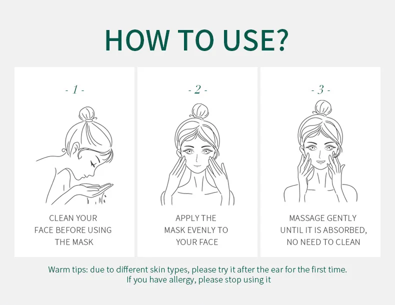 ▶Как использовать 1. Очистите лицо перед использованием маски; 2. Нанесите маску равномерно на лицо; 3. Мягко массируйте до тех пор, пока он не впитывается, необходимо очистить. Теплые советы: из-за различных типов кожи, пожалуйста, попробуйте сначала после уха. Если у вас есть аллергия, пожалуйста, прекратите использовать его