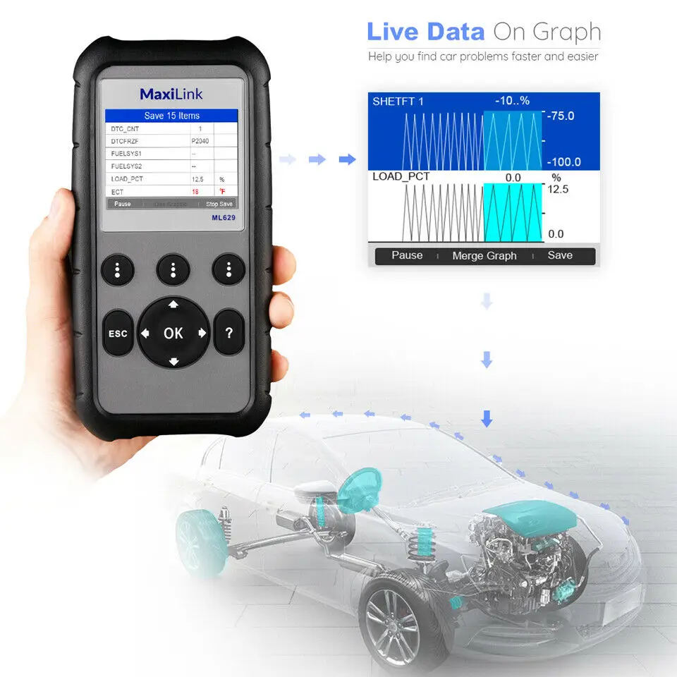 【Retrieve Information in 3 Seconds】Auto diagnostic scan tool ML629 features Auto VIN feature that allows you to retrieve important vehicle identification number for efficient diagnosis. Data Playback and Data Printing is available for better analyse.