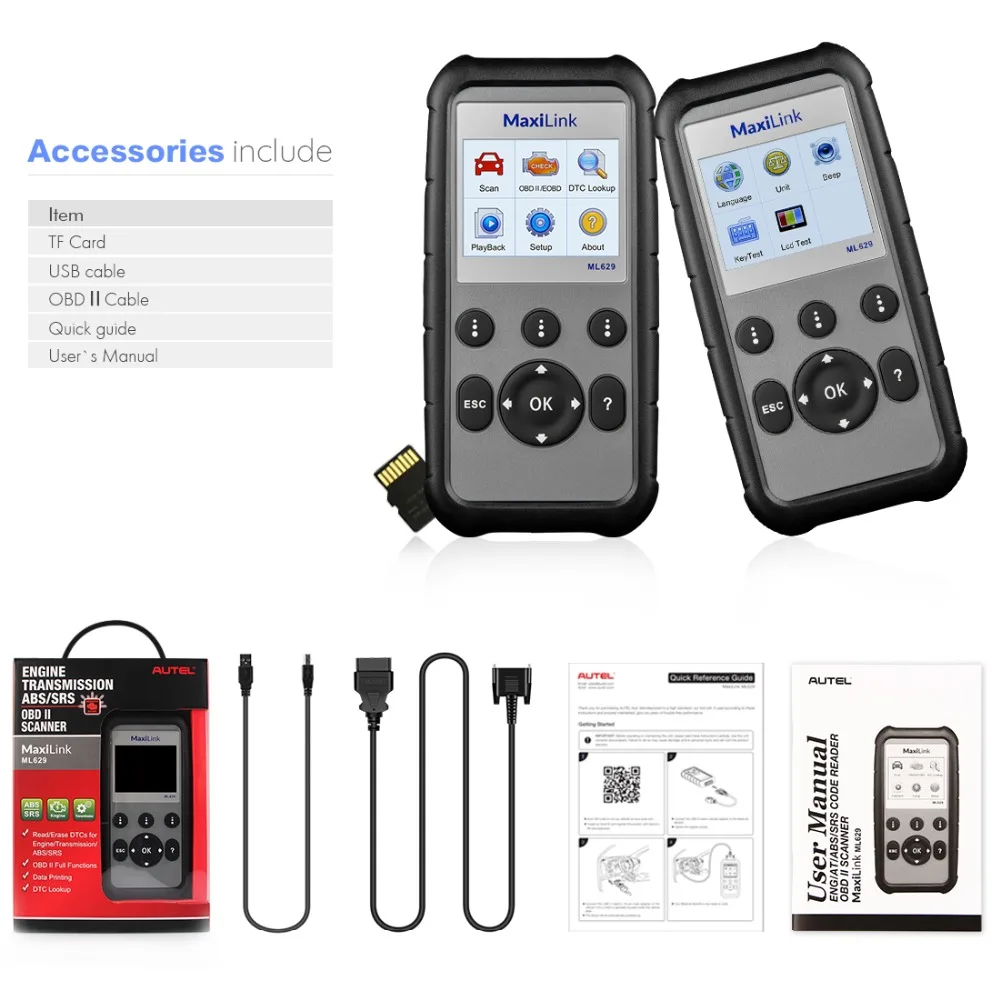 The ABS/SRS/Engine/Transmission + CAN OBDII MaxiLink ML629 is built to help you to determine why the Malfunction Indicator Light or the ABS/SRS warning light is on. Supporting all 10 test modes of OBDII test, ML629 provides you a complete diagnosis. A wide range of European, US and Asian vehicles are covered by ML629, including GM, Ford, Mazda, Toyota, Lexus, Scion, Suzuki, Peugeot, Citroen, Fiat, Abarth, Lancia, Alfa, Honda, Acura, Subaru, Nissan, Infiniti, Chrysler, Renault, Dacia, Land Rover, Jaguar, Volkswagen, Audi, Bugatti, Skoda, Seat, Bentley, Volvo and Porsche, etc. For a detailed vehicle coverage list, please contact our sales support engineer.