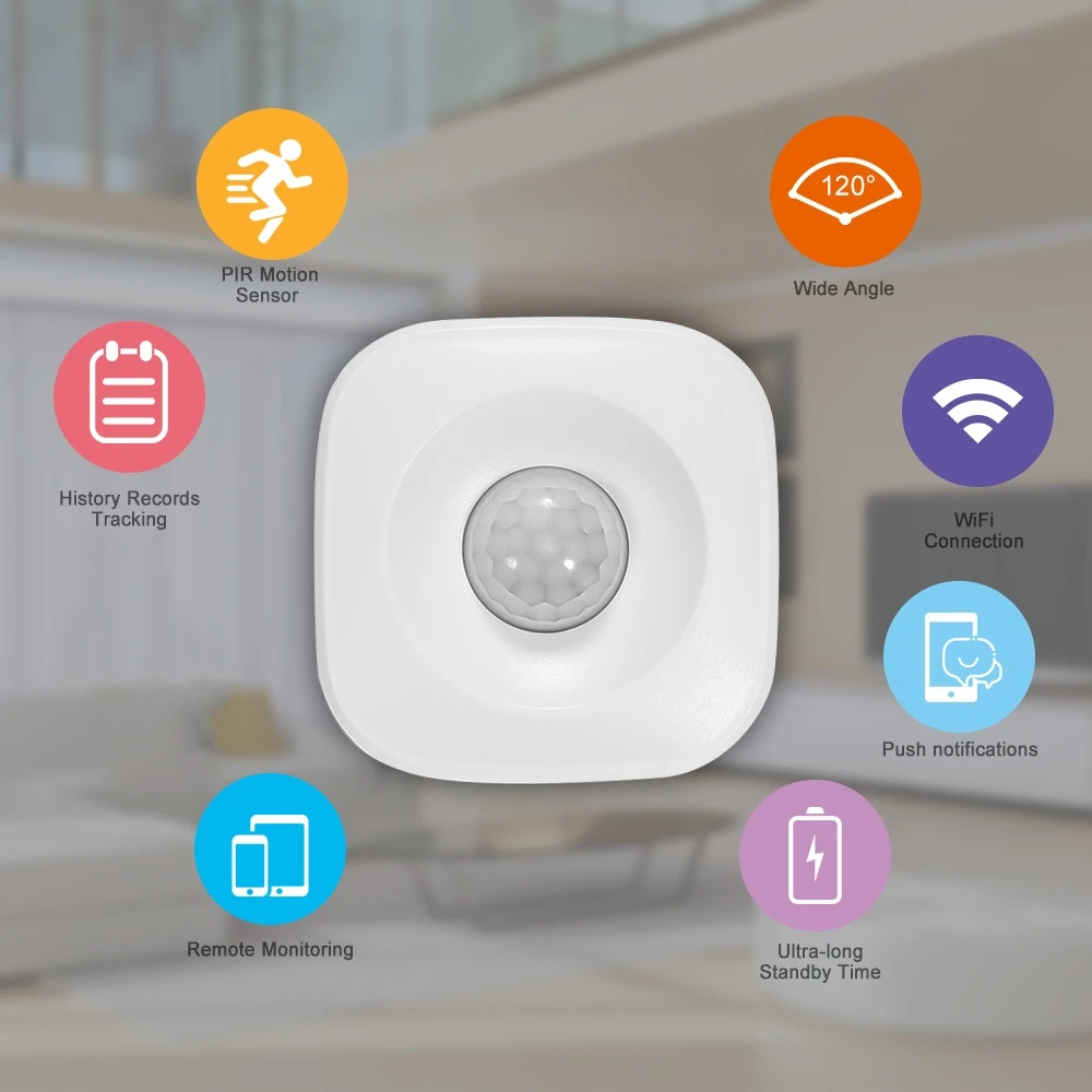 Умный дом Wi-Fi PIR датчик движения: Забудьте о утомительных небольшого размера, которые не занимают место, легко и удобно. Высокая температура огнестойкий материал оболочки, Для внутреннего использования, передовые технологии сварки, через серию сертификация качества, Стабильная и надежная производительность. Поддержка IOS/Android, Сделайте ваш дом умнее.