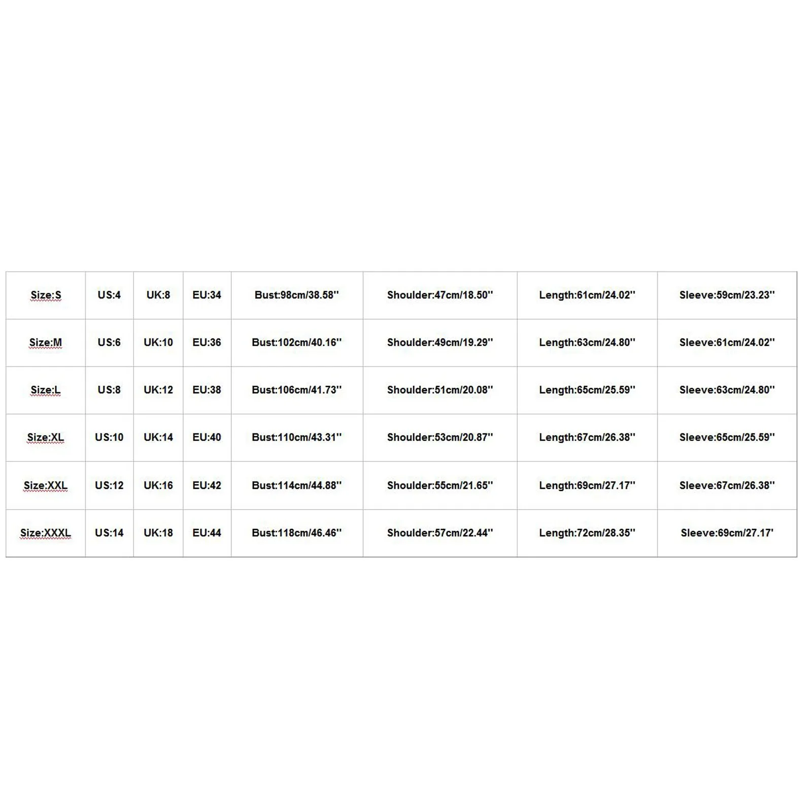 Размер США Великобритания ЕС Бюст Плечо Длина Рукав S 4 8 34 98 см/38,58'' 47 см/18,50'' 61 см/24,02'' 59 см/23,23'' М 6 10 36 102 см/40,16'' 49 см/19,29'' 63 см/24,80'' 61 см/24,02'' L 8 12 38 106 см/41,73'' 51 см/20,08'' 65 см/25,59'' 63 см/24,80'' XL 10 14 40 110 см/43,31'' 53 см/20,87'' 67 см/26,38'' 65 см/25,59'' XXL 12 16 42 114 см/44,88'' 55 см/21,65'' 69 см/27,17'' 67 см/26,38'' XХХL 14 18 44 118 см/46,46'' 57 см/22,44'' 72 см/28,35'' 69 см/27,17''
