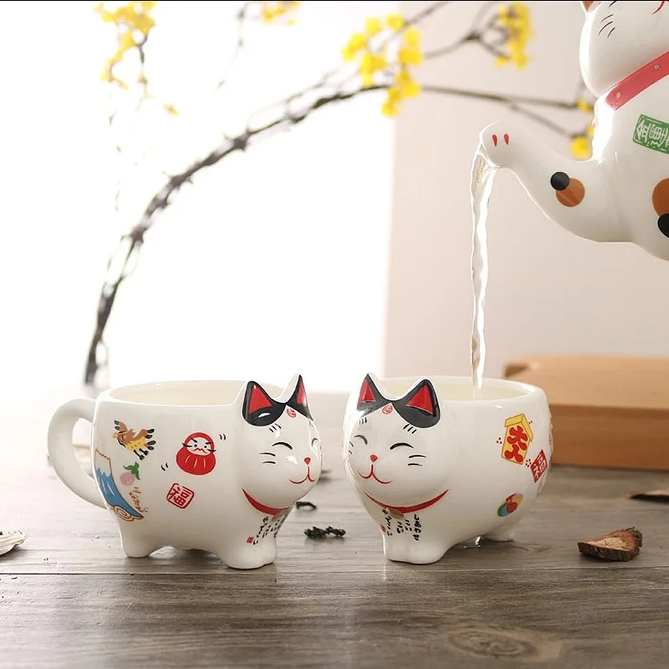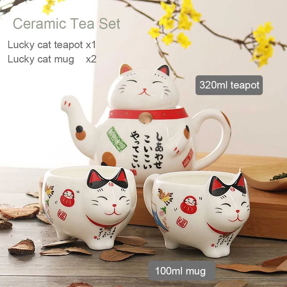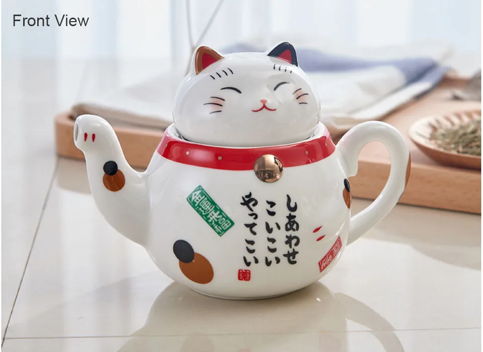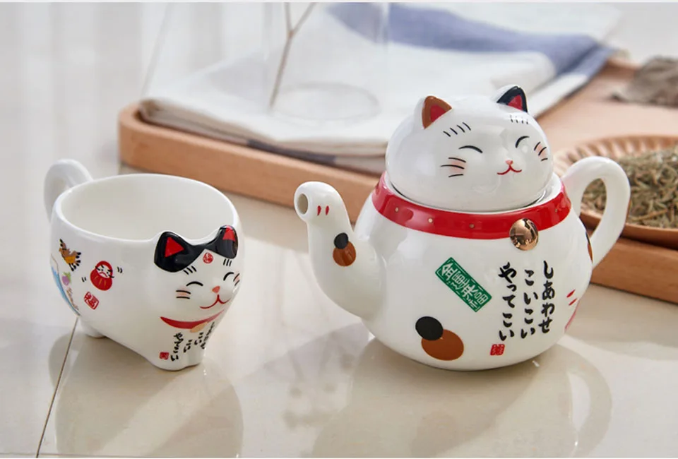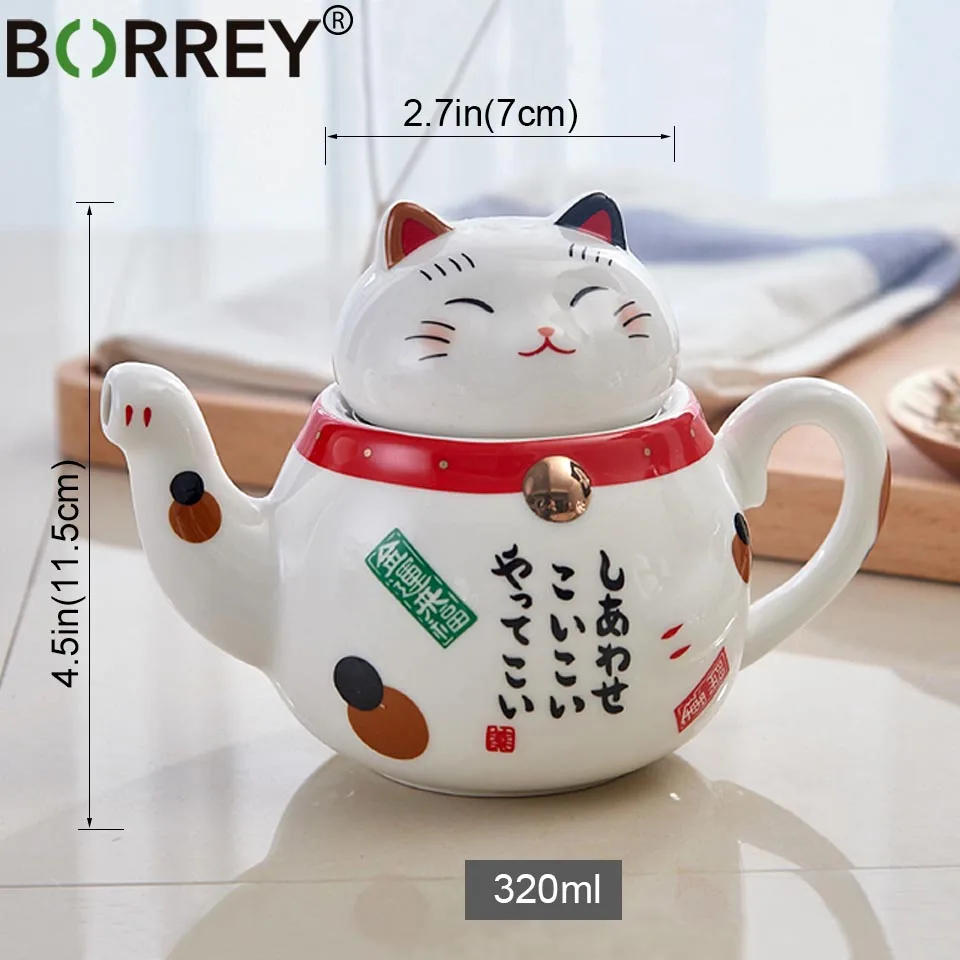 BORREY Lucky Cat Ceramic Teapot Cup Chinese Porcelain Tea Set With Stainless Steel Tea Fliter Maneki Neko Lucky Cat Teapot Mug