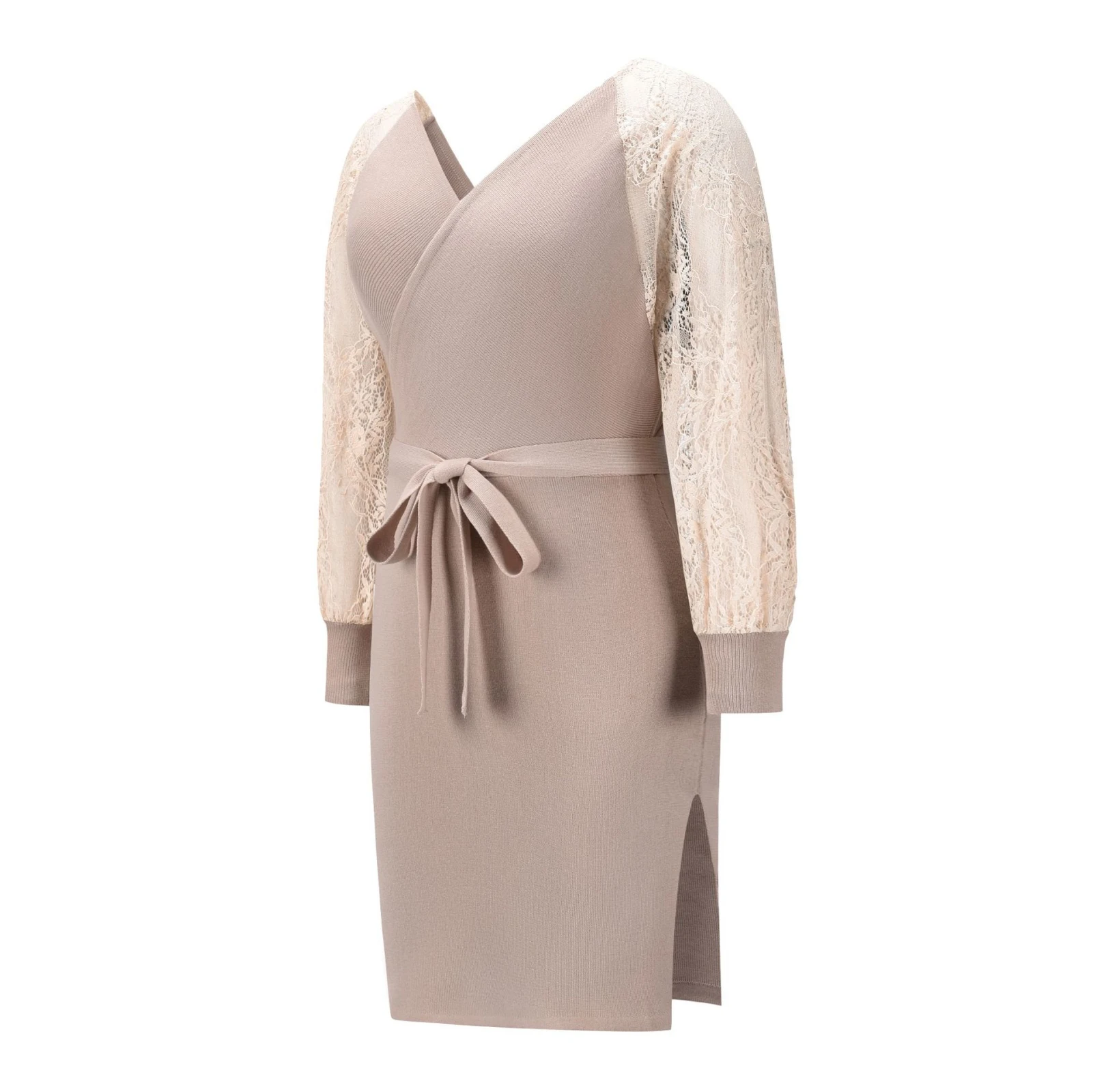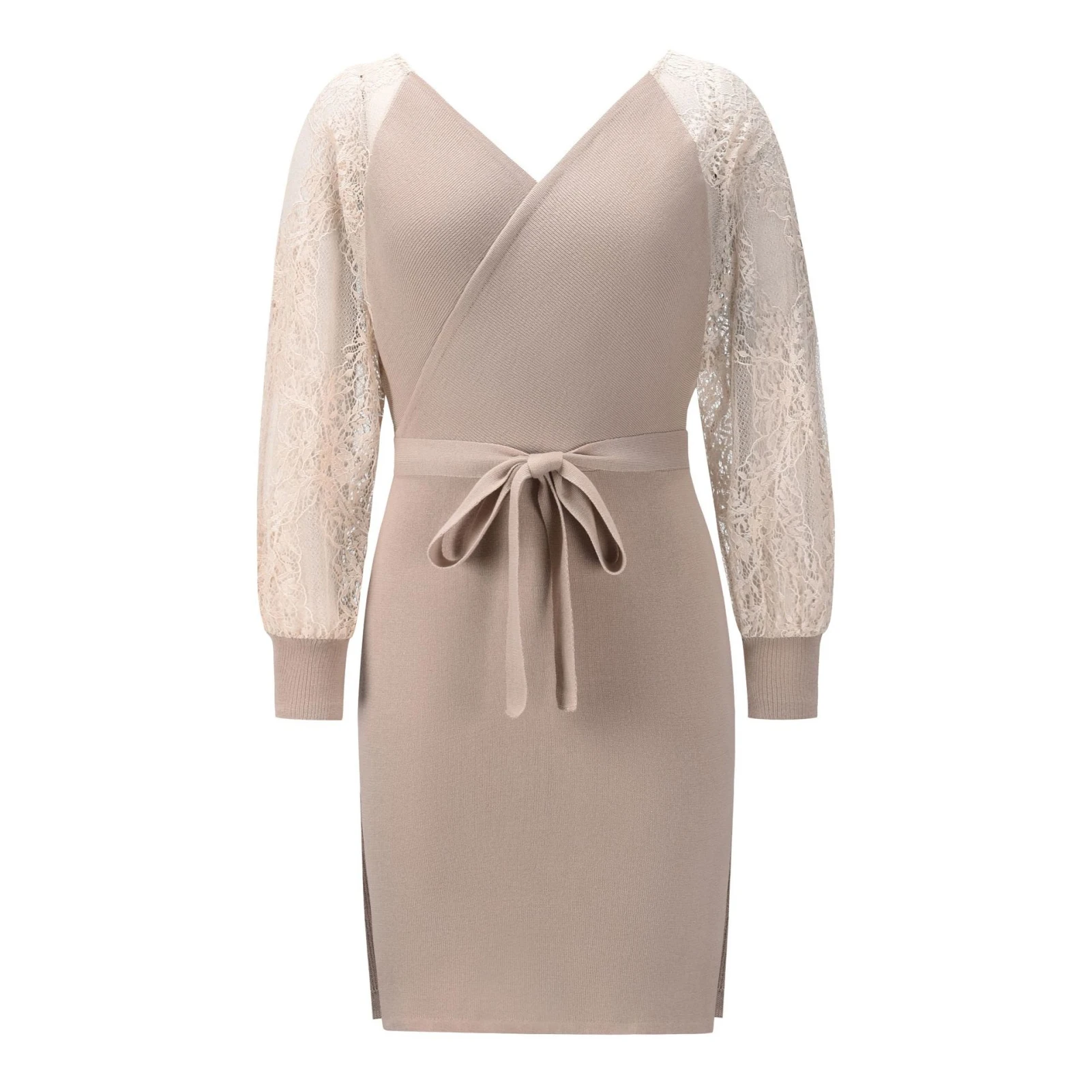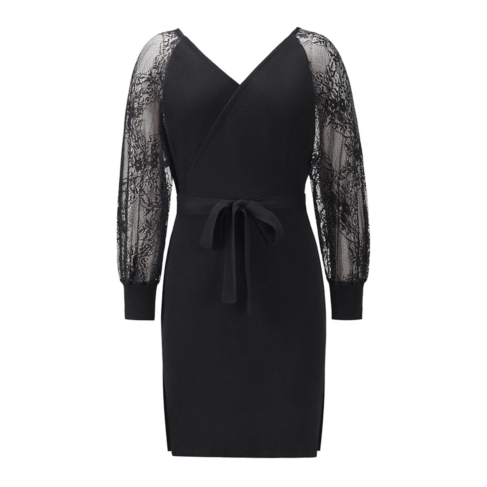 Женское весенне-осеннее платье, кружевное лоскутное платье с длинным рукавом и поясом, Облегающее вязаное платье с разрезом на подоле, вечерний халат, 2021
