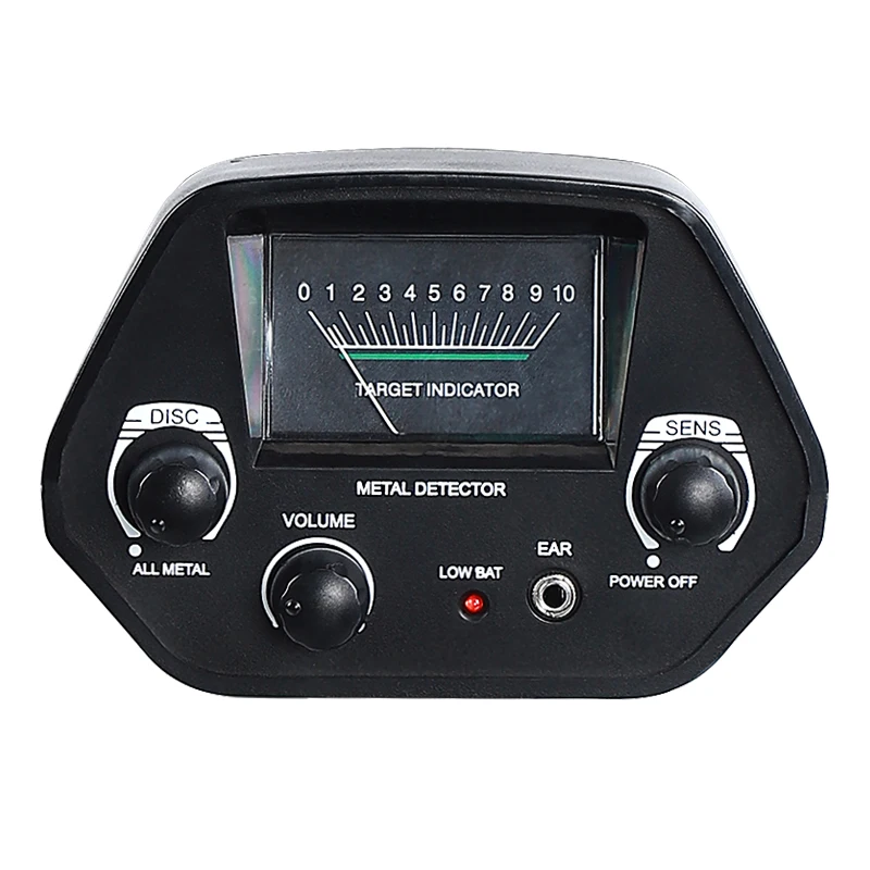 DISC mode: discriminates what kinds of metal is being detected.Volume: to adjust the volume level of speaker and headphone.Earphone jack: lets you connect headphones (not included) to the detector.View meter and pointer: the meter pointer swings to the right if metal is found.Waterproof search coil: lets you search for metal objects under shallow water.Adjustable stem: lets you adjust the detector's length for comfortable use.Handle and elbow support: can let you carry and operate your detector comfortably, to make sure this detector is easy for people of different sizes, ages.Detection indication: audio alert and pointer indicate the detection of metal.Wide range of applications: suitable for finding and testing metal objects, gold and silver jewelry, coins, relics, etc. Whether you are a budding treasure hunter or an experienced metal detecting hobbyist, you can easily use it.Specifications:Material: ABS+metalColor: blackSensitivity: Min. 130mm / 5.12" (test coin: U.S Φ 25)Detect objects: metal (iron nail, iron covering, aluminum rings, small aluminum product, coins, gold, bronze, silver)Detection mode: all metal, discriminationOperating frequency: 5KHzPower supply: 2 * 6F22 9V battery (not included)Operating current: standby 10mA (LCD with backlit color 80mA)Max. 70mA (LCD with backlit color 150mA)Operating voltage range: 9VDetection indication: mechanical pointer mode, audio modeControl: power switchSensitivity: adjustableDetection depth: 100-300mm / 3.94-11.81inVolume: adjustableHeadphone jack: 3.5mmAdjustable height of detector: 780-1070mm / 30.71-42.13inWaterproof search coil diameter: 205mm / 8.07inApplication: testing metal foreign body of r-aw materials, fuel and food, detection of underground pipeline & line, archaeology, exploration, found buried treasures of gold, silver and metal artifacts, the acquisition of scrap metal industry, customs and safety inspection, detection of interpol search, checking metal foreign bodies in delivery and luggage.Operating temperature: -15~45℃ / 5~113℉Storage temperature: -20~60℃ / -4~140℉Package size: 540 * 220 * 110mm / 21.26 * 8.66 * 4.33inNote:1. The search coil is waterproof, but the control housing is not waterproof.2. This product does not include headphones.Packing List:1 * Metal Detector Main Unit1 * Armrest2 * Connecting Rod1 * Search Coil1 * User Manual
