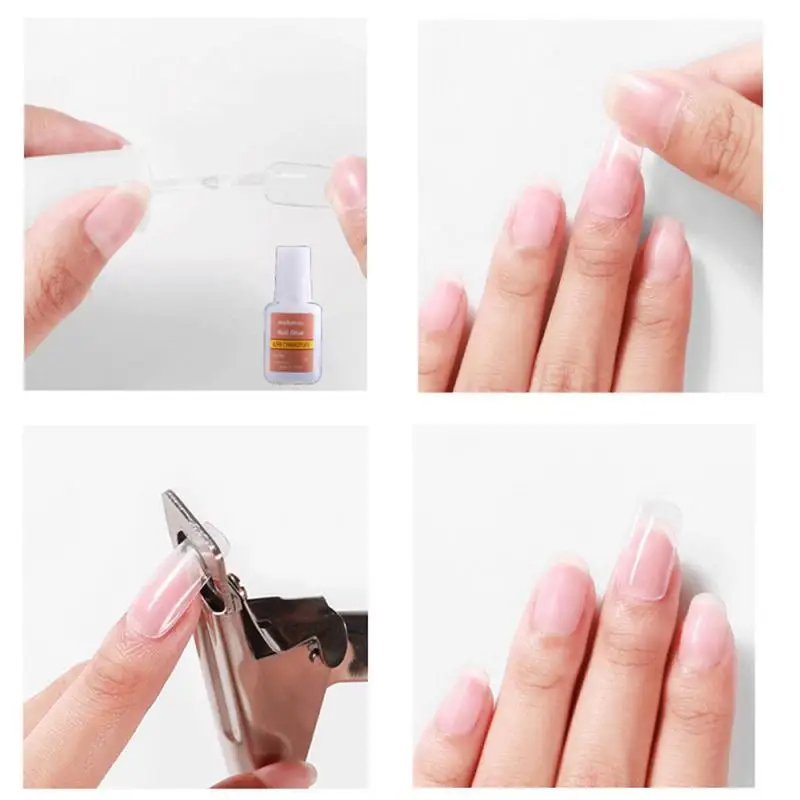 Нанесите клей на заднюю часть поддельного ногтя, затем переведите ноготь с переднего конца ногтя на задний конец и плотно прижмите его. Нажмите на него около 10 секунд, чтобы крепко приклеить его.