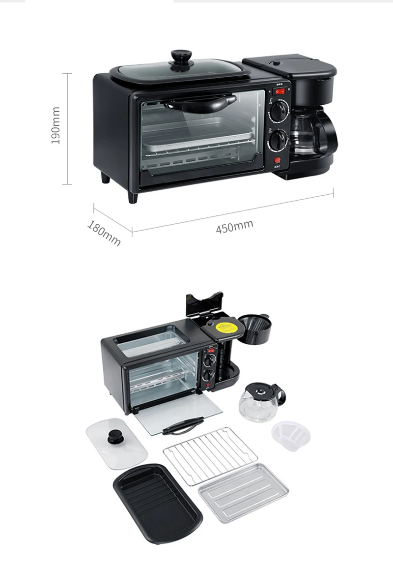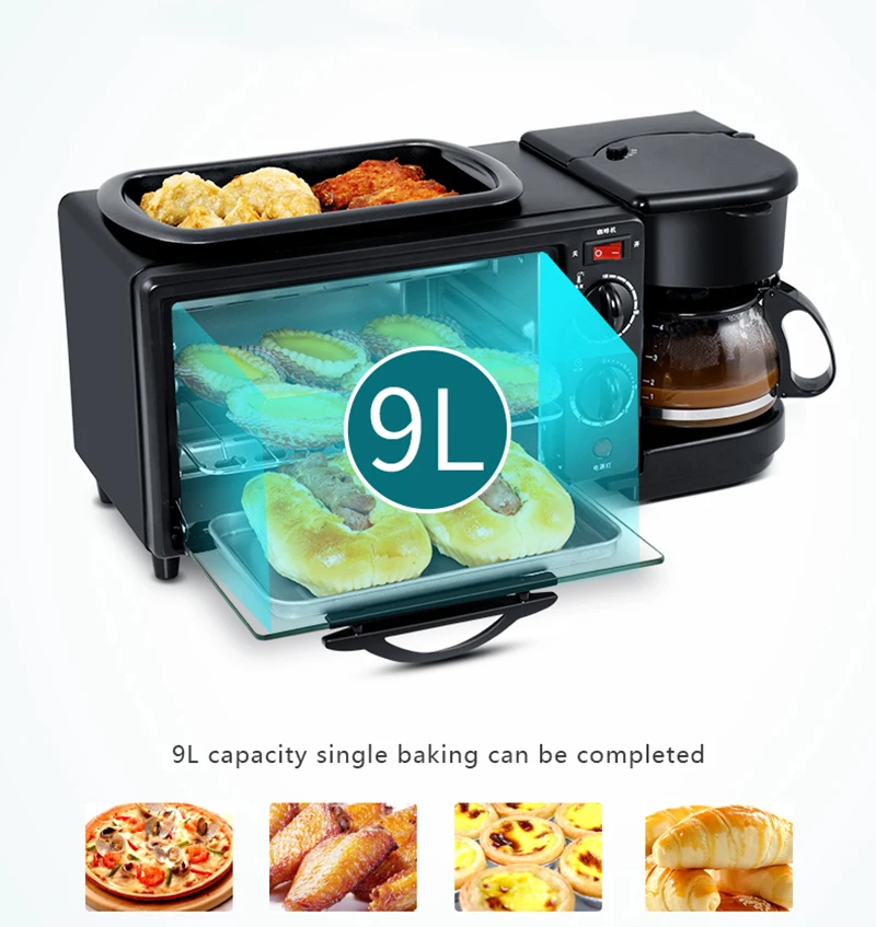 Название продукта: машина для завтрака Емкость духовки: 9 л Мощность духовки: 600 Вт Размер изделия: 45*18*19 см Мощность кофемашины: 450 Вт Вес продукта: около 4,6 кг Диапазон температур духовки: 100 ~ 230 ° c Номинальное напряжение: 220 В ~ 50 Гц Настройка времени печи: 30 минут
