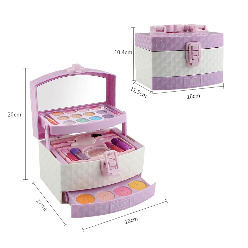 Содержит несколько косметических средств:Набор косметических игрушек для девочек включает Тени для век, румяна, пудру, блеск для губ, помады, лаки для ногтей, кисти для макияжа, слойки, удовлетворяют все потребности вашего ребенка. Экологичный лак для ногтей для малышей и детей, лак для ногтей быстро и легко отшелушивается при сушке.
