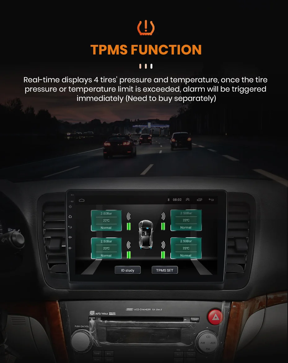 Отображает 4 давления и температуры в режиме реального времени. Как только давление или температура в шинах будут необычными, сразу же будет сигнал тревоги.