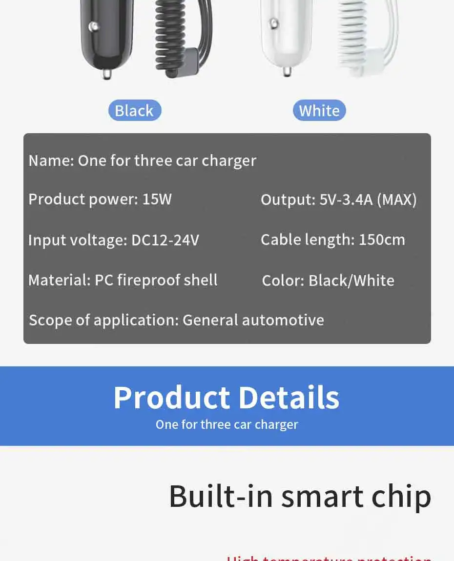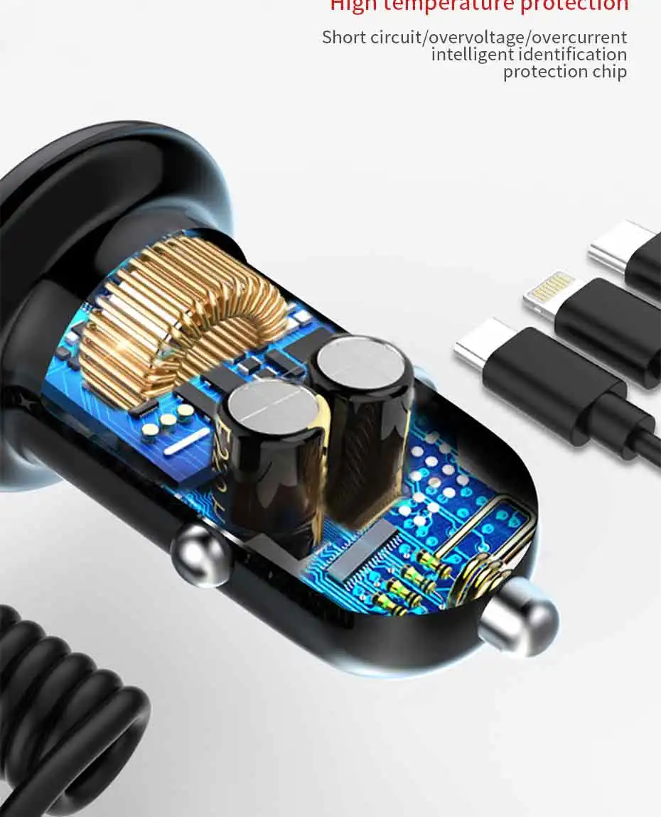 2. 3 in 1 car charger with Type-C/IOS/Micro-USB cables, meets your any requirements of charging.