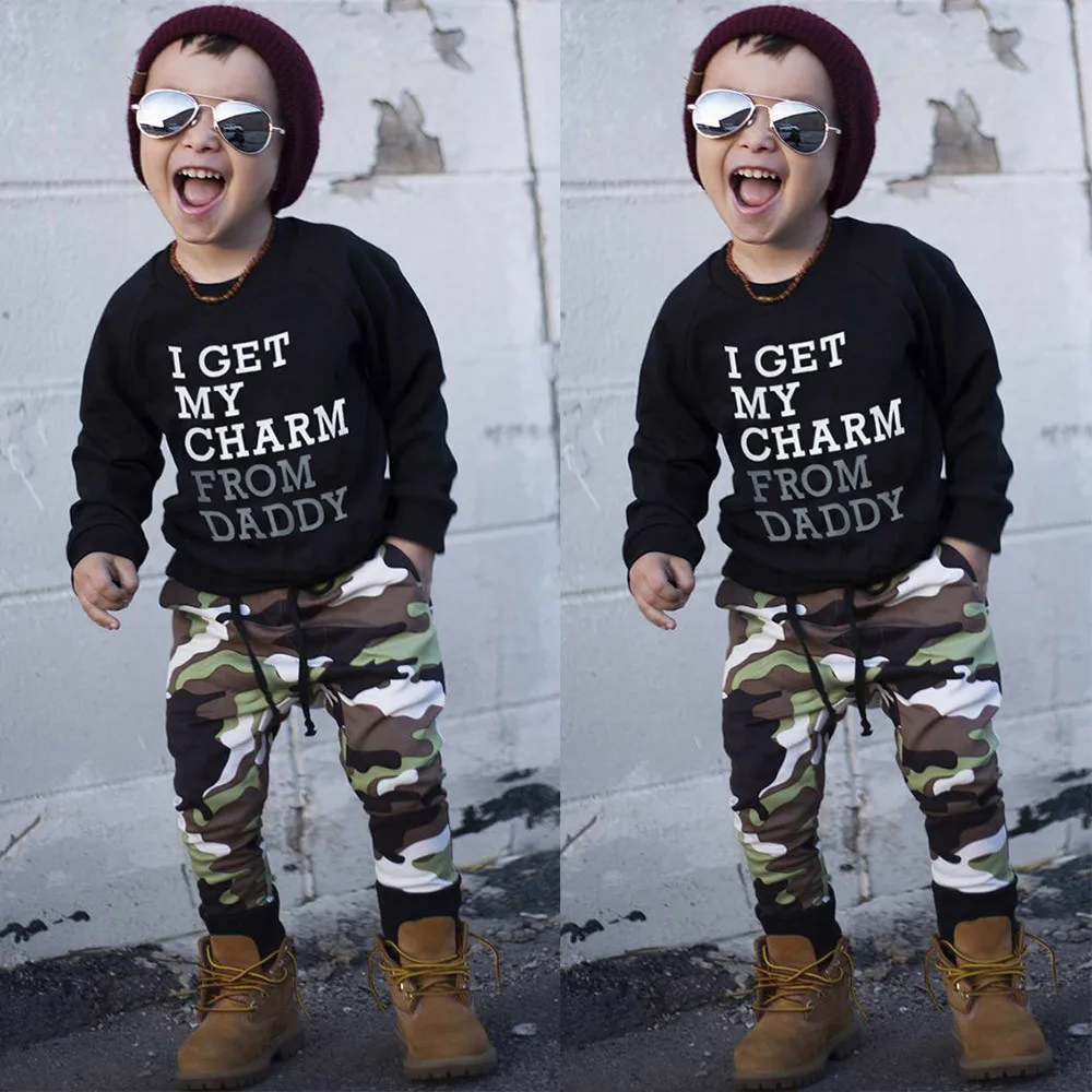 4. Новые милые осенне-зимние детские футболки с надписью для мальчиков, топы + камуфляжные брюки Комплект одежды, модный и подходит для вашего маленького ребенка