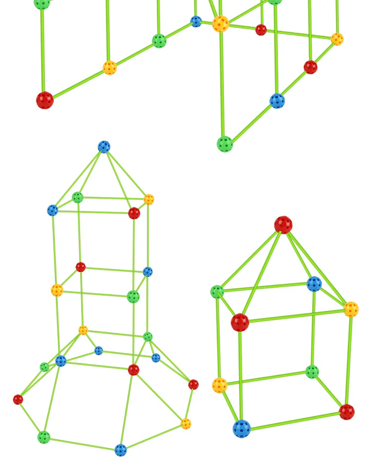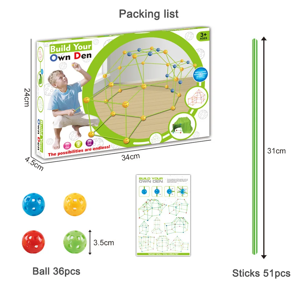 1. Строительный комплект форта: включает в себя множество палочек и 36 шаров. Наш магический набор позволяет ребенку создавать форты всех форм и размеров! (Одеяло в комплект не входит.)