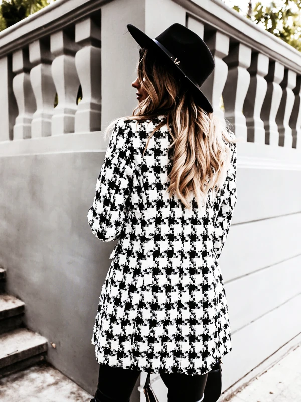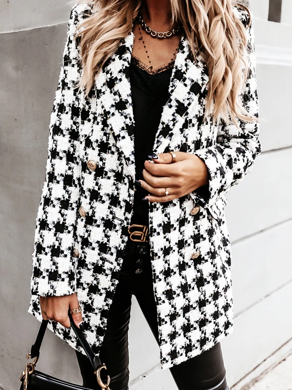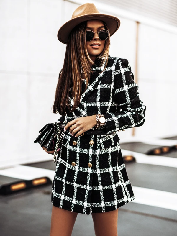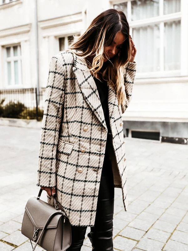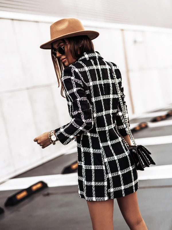 Лидер продаж, осенне-зимняя верхняя одежда, двубортное шерстяное пальто средней длины с длинными рукавами и лацканами, модные клетчатые пальто
