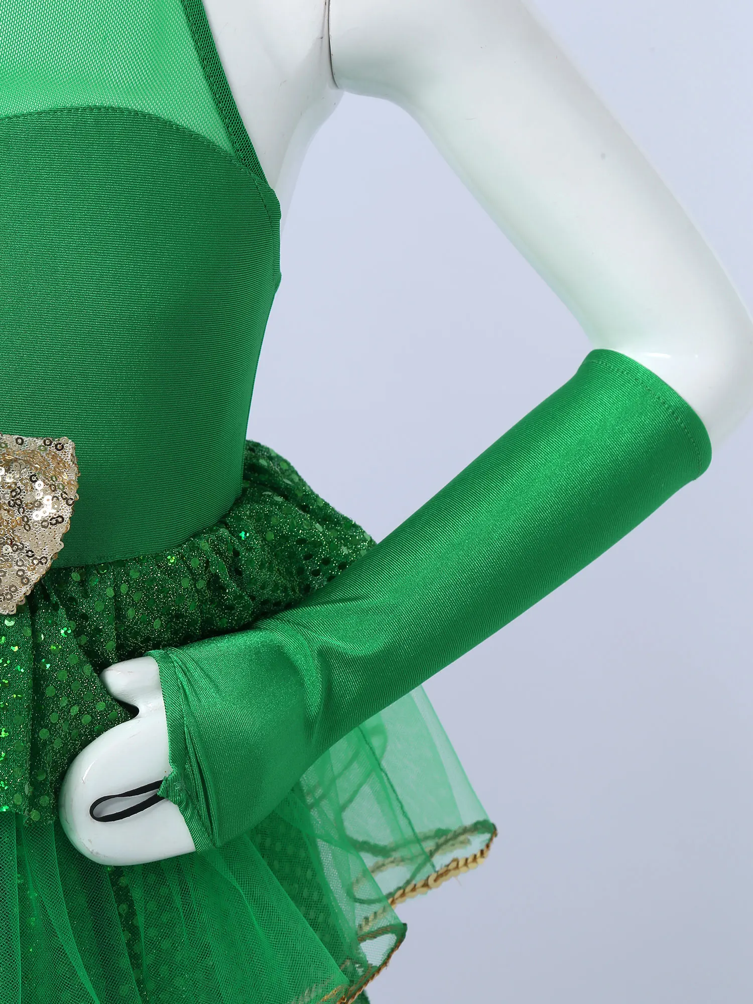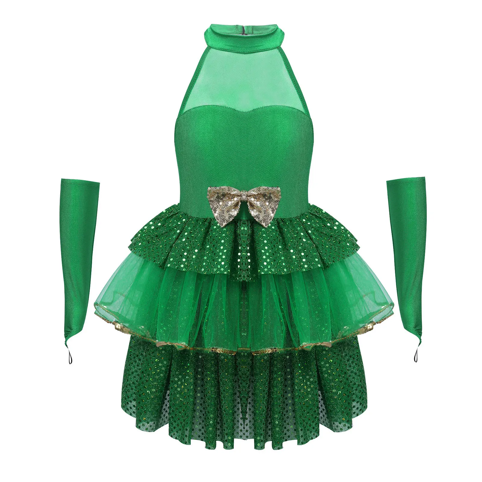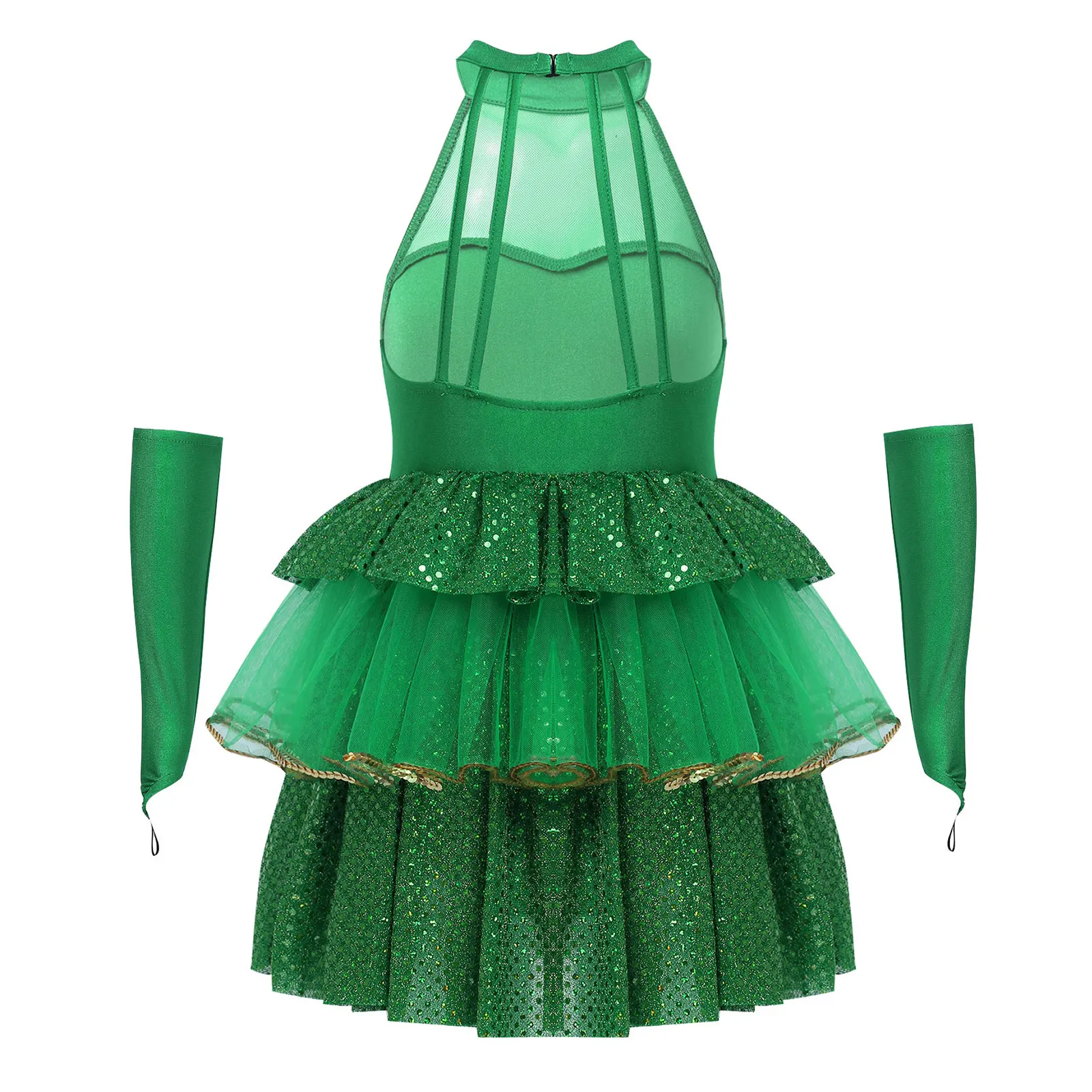 3 слоя юбка, верхний и нижний слой украшен зелеными пайетками, средний слой сетки краями с золотые блестки. Со встроенными шортами.