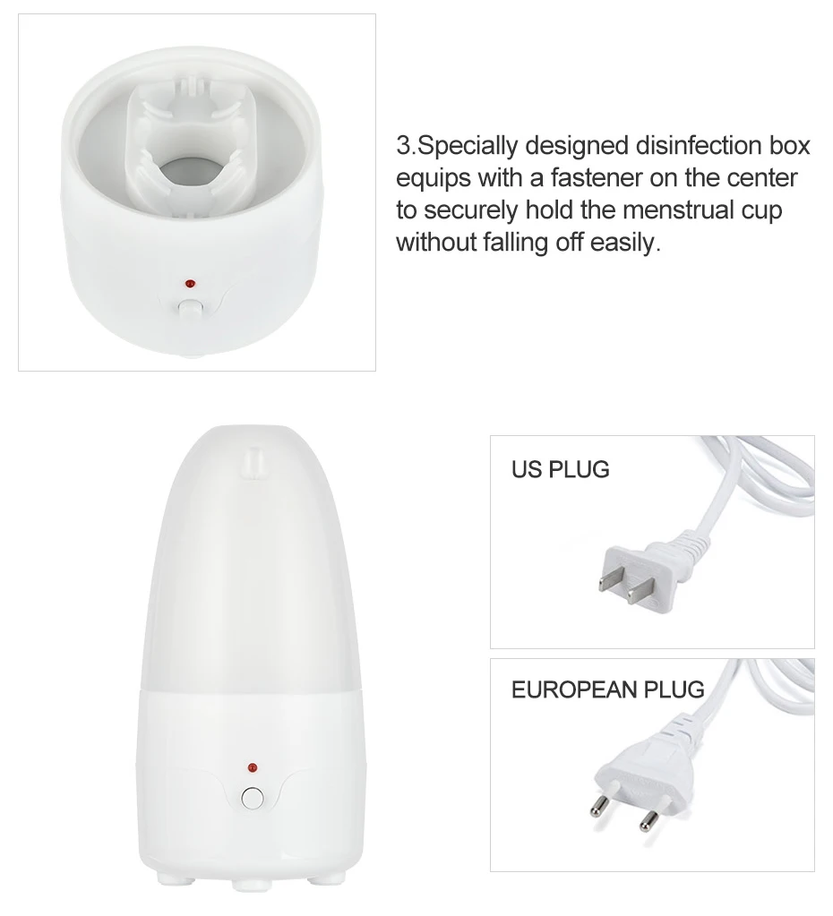 Особенности 1. Высокотемпературный пар может эффективно проникать в каждый угол стерилизатора для быстрой и полной дезинфекции, чтобы избежать любых мертвых концов. 2. Специально разработанная дезинфекционная коробка оснащена застежкой на центре, чтобы надежно удерживать менструальную чашку, не падая легко. 3. Простота в использовании, просто добавьте 5 мл очищенной воды и нажмите кнопку питания, чтобы начать работу, она автоматически отключится через 20 минут работы. 4. Высококачественный полипропиленовый материал не содержит Бисфенол А и не растворяется при высокой температуре. Технические характеристики Материал: полипропилен Цвет: белый Тип вилки: штепсельная вилка европейского стандарта/штепсельная вилка американского стандарта/штепсельная вилка британского стандарта (опционально) Номинальное напряжение: 110-240 В Номинальная мощность: 99 Вт Номинальная частота: 50/60 Гц Размер: прибл. 17,5*8,3 см Посылка включает в себя: 1 * Электрический паровой стерилизатор с кабелем питания 1 * Руководство пользователя