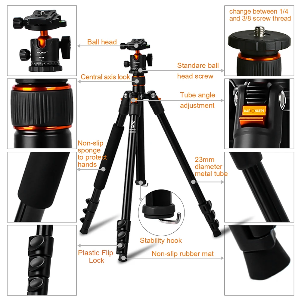 Регулируемая высота: штатив имеет 4 секции для удлинения и 3 уровня для регулировки, рабочая высота составляет около 21,85-64,17 дюйма (шаровая Головка входит в комплект), универсальная для удовлетворения ваших потребностей.