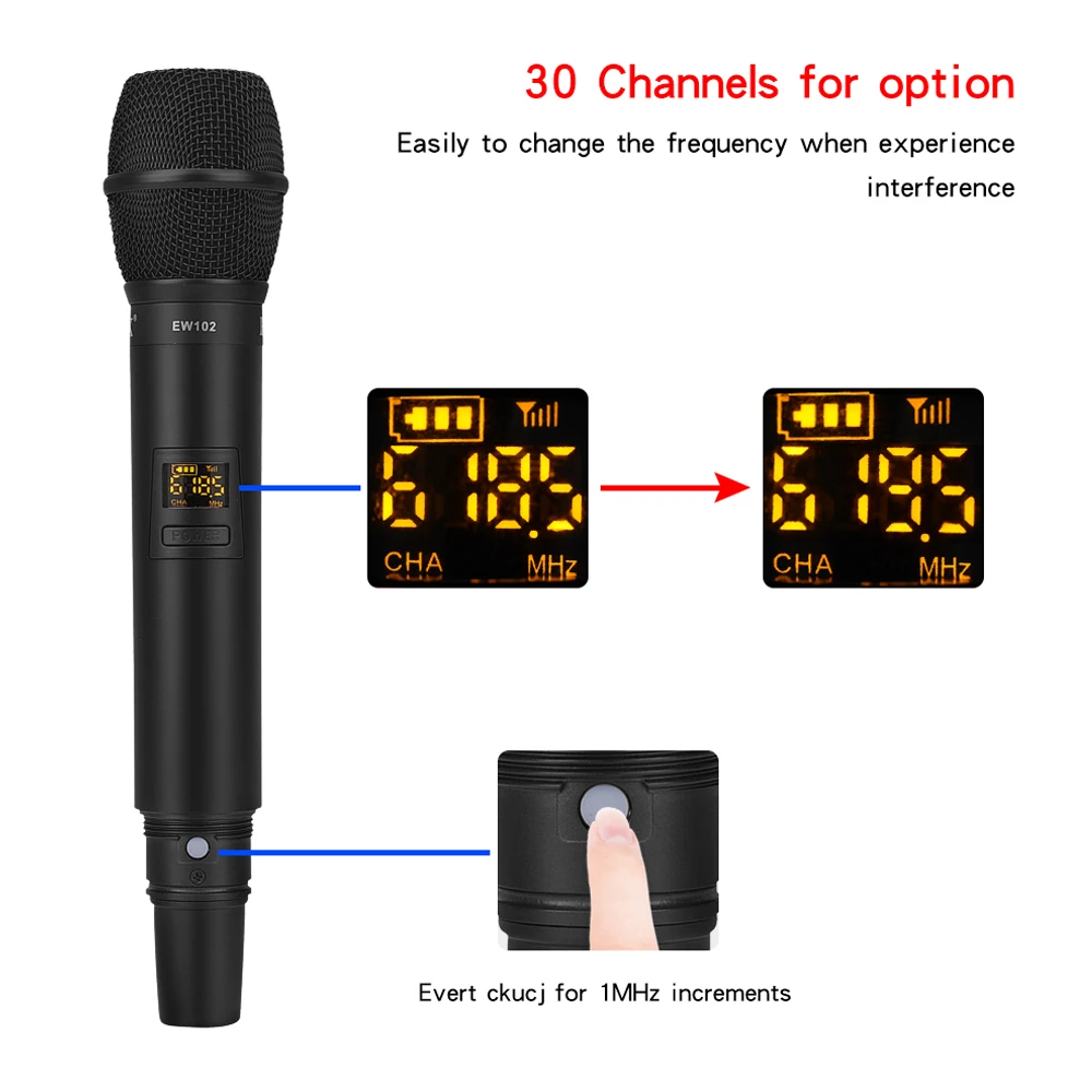 1. UHF Регулируемая частота, 30 выбираемых частот для производительности без помех. 2. Пластиковый приемник, полуметаллический ручной микрофон. 3. Перезаряжаемый приемник с литиевой батареей (1200 мАч), может использоваться непрерывно около 6 часов 4. Ресивер: 6,35 мм (1/4 ") выход и 3,5 мм адаптер в качестве подарка. 5. Совместимость со многими устройствами: Полиамид (PA), смесители, колонки, усилители и караоке машины с 6,35 мм (1/4 ") Микрофон вход переменного тока, iPhone или Android смартфоны, планшеты, ноутбуки, с 3,5 мм адаптер. 6. Простота в использовании: подключи и работай, подключите мини-приемник к разъему микрофона для любых динамиков, миксеров, усилителей, цифровых рекордеров или некоторых DLSR камер для аудиовыхода, включите мини-приемник и микрофон, он готов к работе, прост в использовании. 7. Динамический микрофон с кардиоидным полярным узором: Кардиоидная капсула с теплым, гладким звуком и отличным отказом от отзывы. Обеспечивает Максимальное усиление до Отзывы и делает ваш голос режущим через любую смесь. Он обеспечивает низкую чувствительность к шуму, высокий коэффициент усиления, прежде чем оставлять отзывы, и превосходное качество звука. 8. Диапазон: до 195 футов (более 50 метров)