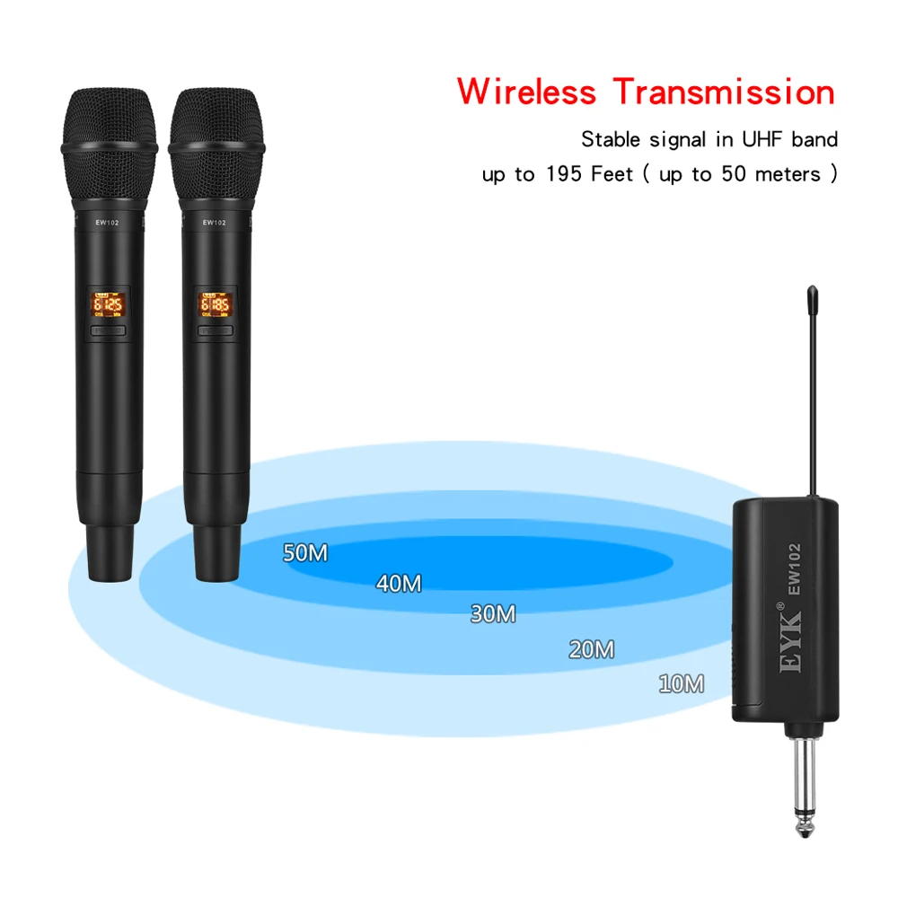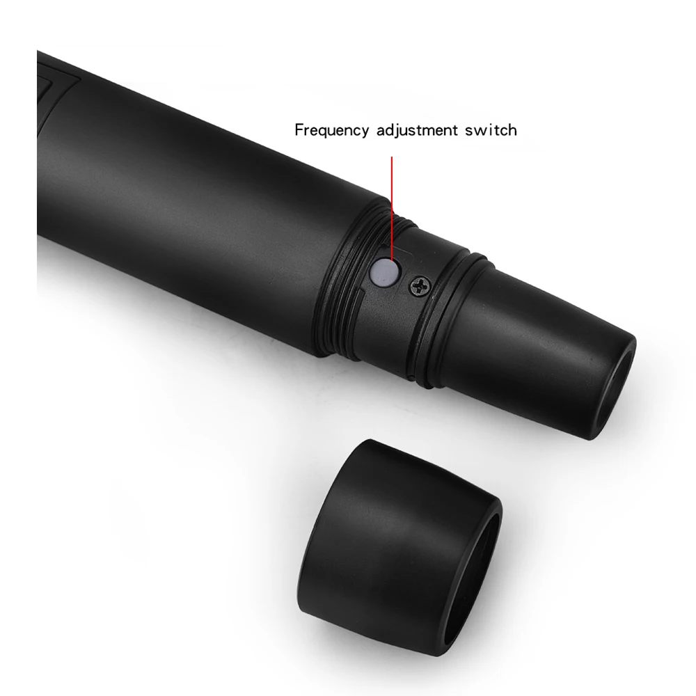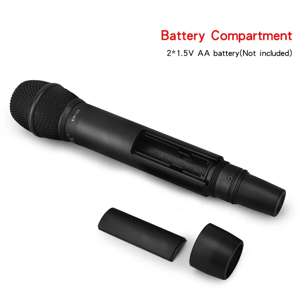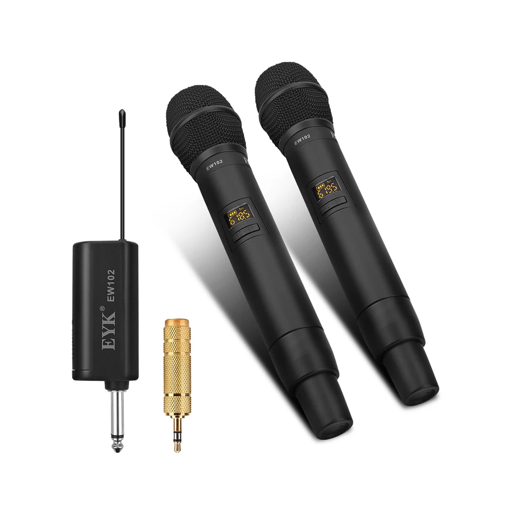 Беспроводная микрофонная система UHF с двумя ручками, мини-приемник с перезаряжаемой батареей. Аккумулятор AA используется в ручном, который легко заменить. Приемник 6,35 штекер, может быть непосредственно подключенный к портативные колонки, смесители и т. д. Подходит для семьи, компании, школы, активного отдыха (например, спортивных мероприятий, вечеринок и т. д.).