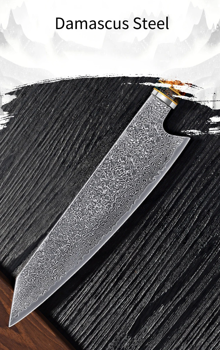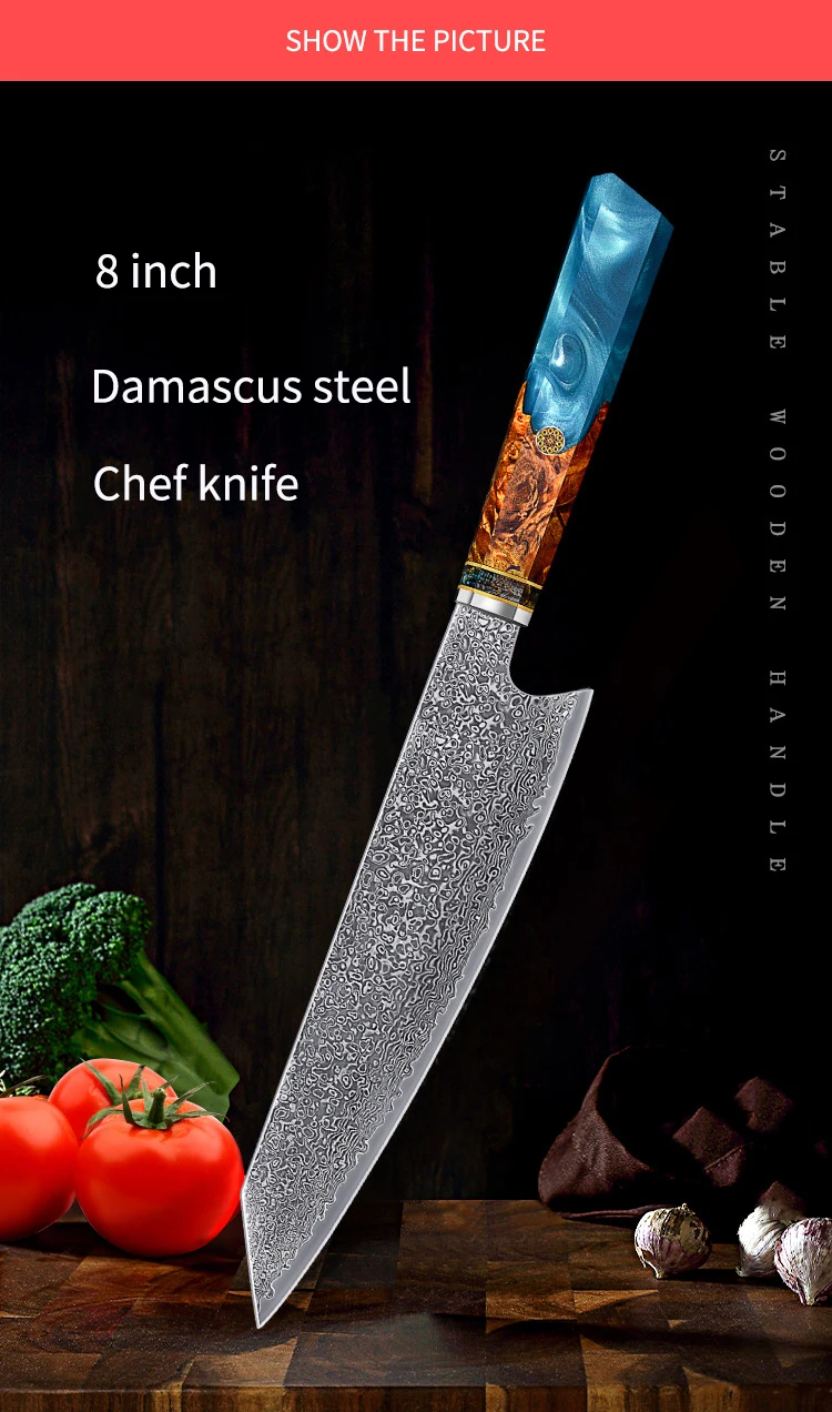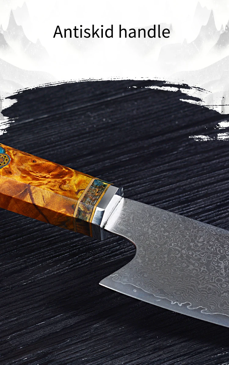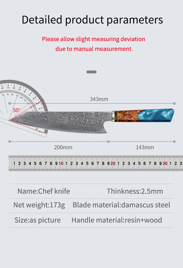 Особенности: Это лезвие ножа высшего класса является сильным и острым благодаря большему количеству процедур. Высокое качество и долговечность. Технические характеристики: 1. Общая длина: 343 мм 2. Длина лезвия: 200 мм 3. Вес ножа: 173 г 4. Материал: Дамаск 5. Твердость: 60-62 HRC Упаковка: 1 шт. нож Примечание: 1. Пожалуйста, не используйте его для резки замороженных продуктов. 2. Из-за различных настроек монитора и освещения фактический цвет изделия может немного отличаться от цвета, показанного на фотографии. Спасибо! 3. Замеры сделаны вручную, поэтому возможны незначительные отклонения