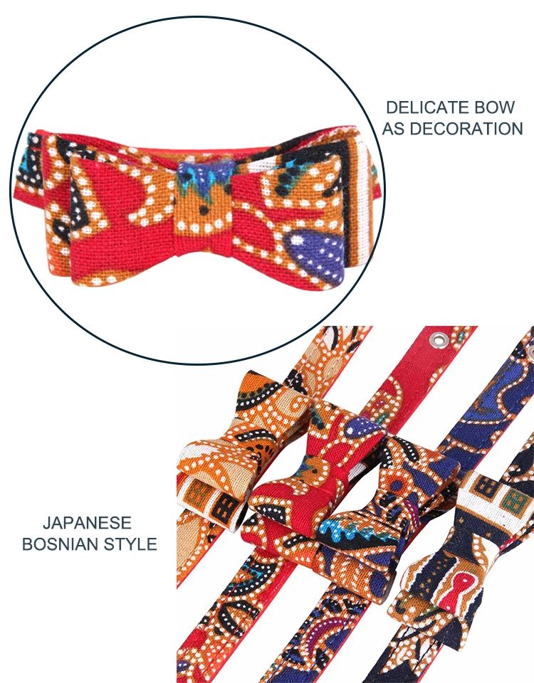 Этот ошейник для домашних животных, изготовленный из хлопчатобумажной ткани, хорошо сделан и надежен в качестве. Наиболее привлекательным украшением является бант. Дизайнер проектирует принты на воротнике, вдохновленные японским и боснийским стилями, и подгоняет серию аксессуаров для домашних животных, включая поводки и ремни безопасности. Ошейники с застежкой, ошейники с бантами, шарфы для собак и стильные ошейники для собак. Подходит для маленьких и средних собак, кошек, кроликов, щенков, котят и различных милых домашних животных.