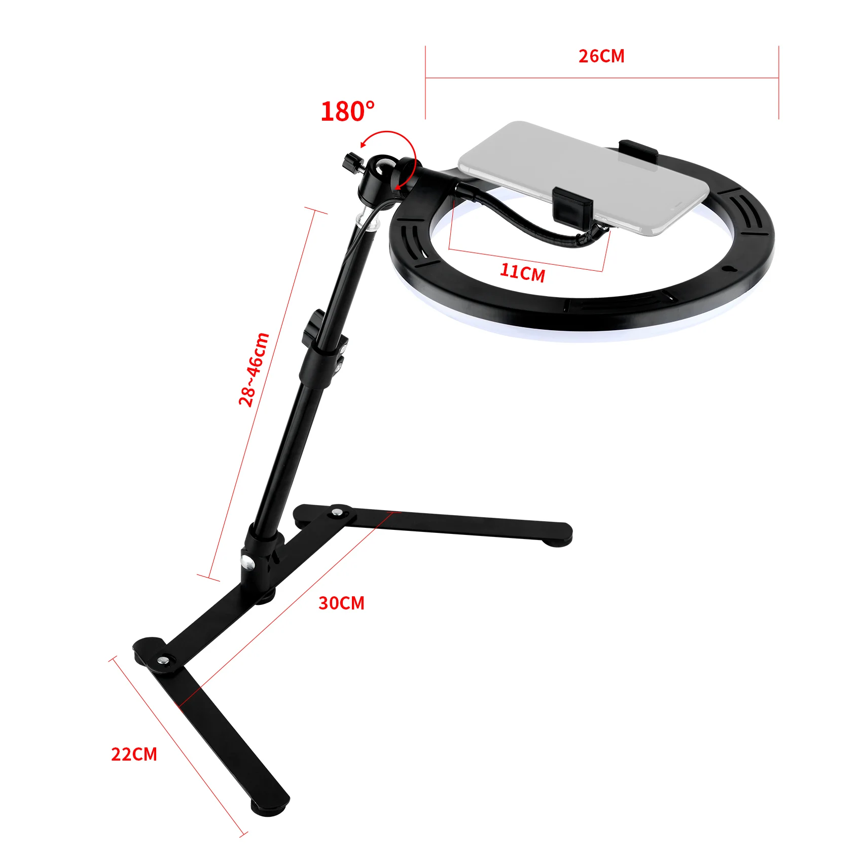 Описание: Эта настольная подставка очень удобна для большинства мобильных телефонов. Это поможет вам сэкономить много энергии при видеосъемке, фотосъемке и потоковом режиме и т. Д. Широко применяется в любых магазинах, семьях, стадиях, студиях, вещании, телевизионных станциях и т. Д. Технические характеристики: Настольная подставка для рук Материал: железная подставка и пластиковый зажим Несущая способность стойки: максимум 0,6 кг Ringlihgt Особенности: Светодиодная кольцевая лампа С питанием от флеш-накопителя USB Мощность: 12 Вт Световой поток: 1500LUx Диммер: 1% ~ 100% Цветовая температура: 3200K-5500K (+/-300K) Количество светодиодов: 120 шт. Внешний диаметр: 26 см, внутренний диаметр: 20 см Совместимость на уровне систем: Все Сотовые телефоны шириной 5-10 см Ringlight & Stand комплектация: 1x настольная подставка 1 х 26 см ringlight 1x универсальные чехлы для мобильного телефона с зажимом Только подставка Комплект поставки: 1x настольная подставка 1x универсальные чехлы для мобильного телефона с зажимом