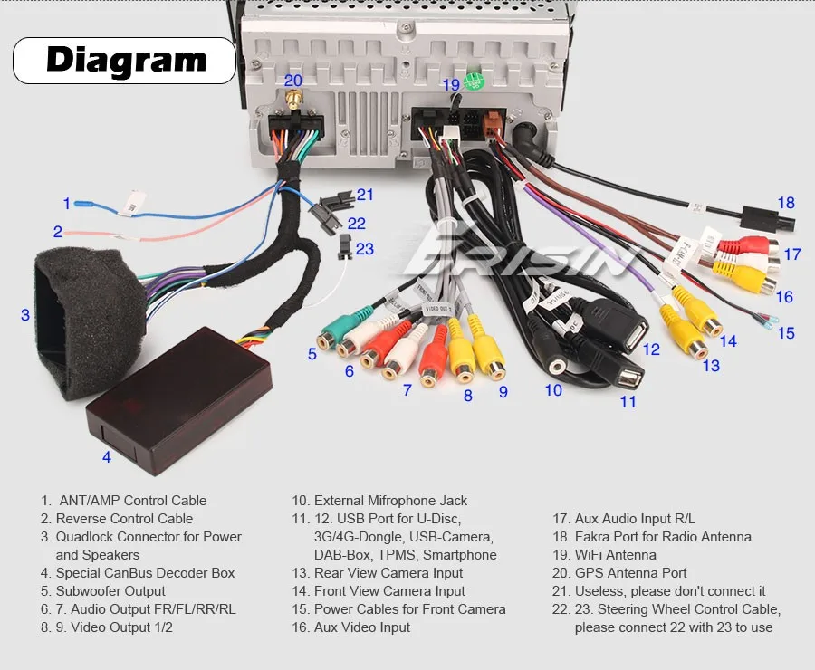 Может быть подключен к U-Disc, 3G/4G Dongle, CarPlay Dongle, TPMS-Device, DVR-Camera, DAB + Box, смартфону и т. д.