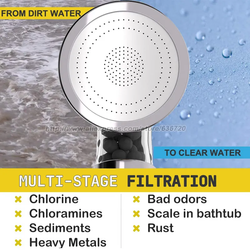 Наша лучшая фильтрованная душевая головка состоит из нержавеющей стали, пластика с фильтрующим картриджем витамина С + универсальная минеральная смесь турмалина, каменные шарики Сеула для лучшего спа-душа