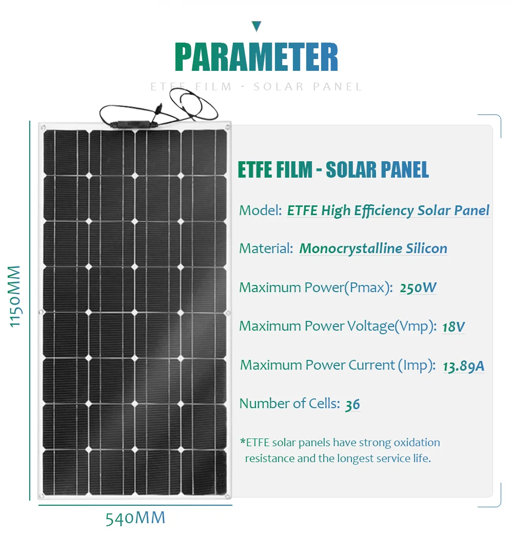 Солнечные панели ETFE обладают высокой стойкостью к окислению и долгим сроком службы. Когда люди делают это, цена относительно высокая. Если вы хотите поставить солнечные панели на море или в некоторых местах с сильным соляным туманом, мы предлагаем вам выбрать монокристаллические солнечные панели ETFE.