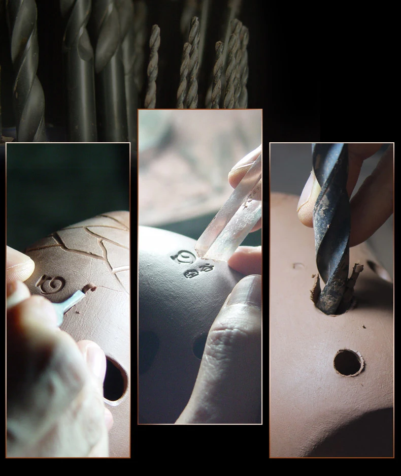 After selected pottery clay, hand-made embryos, precise openings, preliminary tuning, fine trimming, second tuning, natural drying, third tuning, re-grinding, artificial carving, high-temperature firing, after completion Fourth tuning, fine polishing, tuning again before leaving the factory, etc.