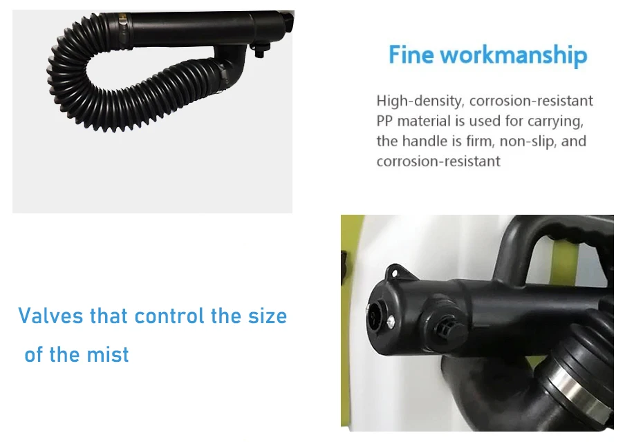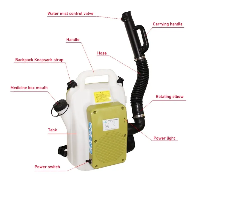 Портативная Интеллектуальная электрическая машина холодного тумана 450 Вт Области применения: 1. Борьба с вредителями, очистка воздуха, антивирус, профилактика заболеваний, профилактика эпидемии для больницы, школы, отеля, дома, Склад, завод и т. д. 2. Распыление и иммунитет для птицефабрики, ветеринарной больницы, больницы для животных, центра здоровья животных, инспекции на входе и выходе и Карантинное отделение, таможня и т. д. Особенность: 1. Сильное проникновение, быстрое растекание; При регулируемых и равномерных капельках, туманообразователь наносится как для космического спрея, так и для остаточного Спрей. 2. Изготовлен из силикагеля, труба раствора и воздушная труба Антикоррозийные; Головка туманообразователя устойчива к растрескиванию, ударопрочна и Постоянная температура. Срок службы всей машины длительный. 3. Масштаб резервуара раствора и полупрозрачная крышка резервуара позволяют вам точно смешивать химический раствор. 4. Запатентованная технология для предотвращения возврата раствора. 5. Благодаря двигателю с преобразованием частоты, регулируемому подъему и уровню шума генератор тумана очень экономит химические вещества.
