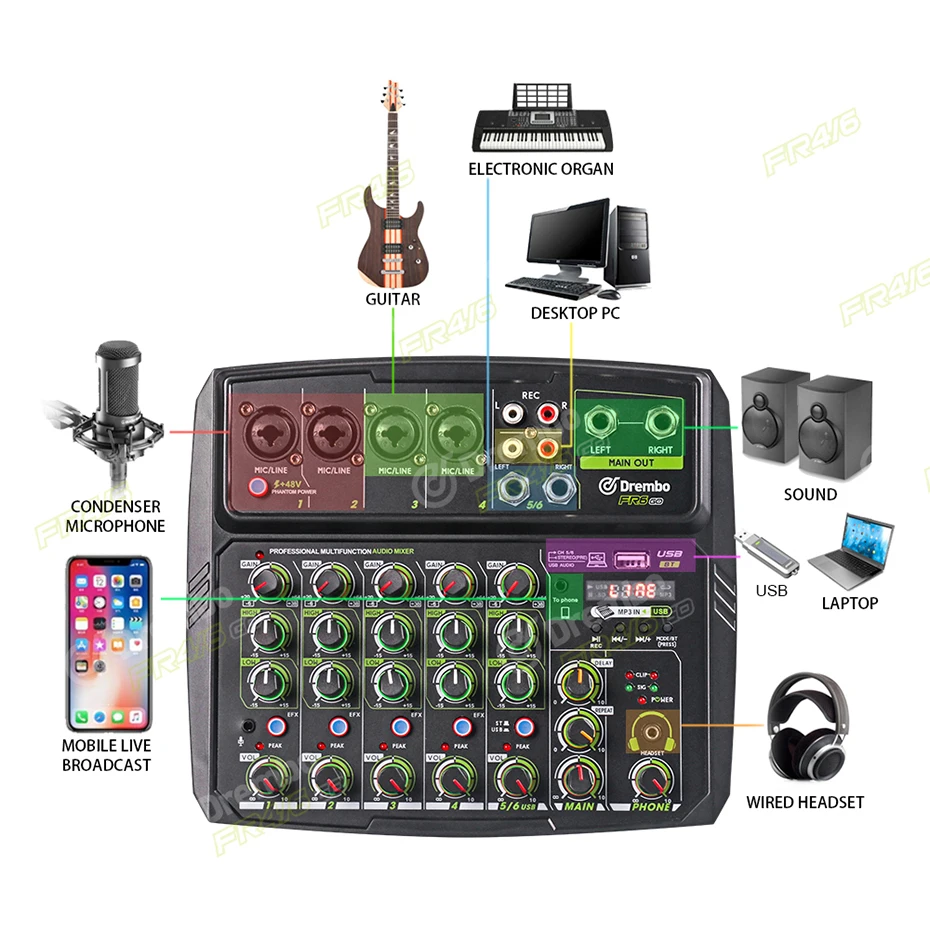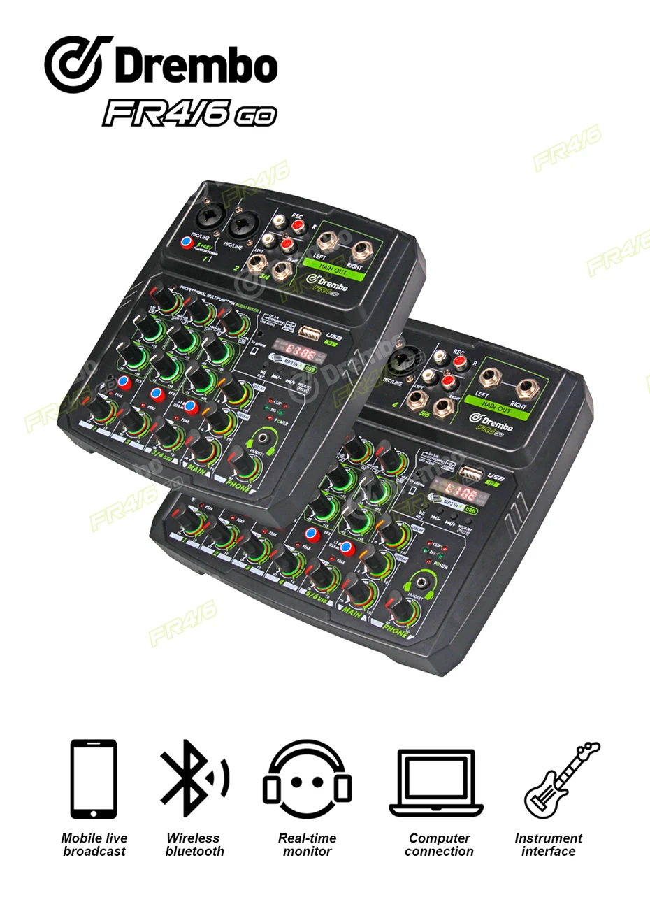 Аудиомиксер серии FR-GO-это совершенно новый дизайн и стильный DJ-миксер. Он имеет различные цветные оболочки. Это многофункциональный 4/6 канальный миксер со звуковой картой. Небольшие партии и другие пользователи.
