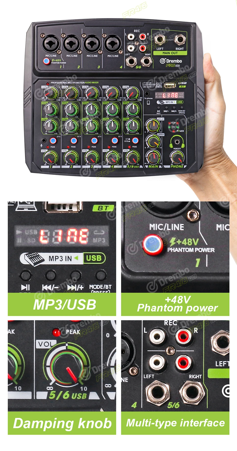Миксер оснащен усиления входного сигнала и высокие и низкие басы, встроенный 48В источника питания для прямого источника питания конденсаторные микрофоны, высокой четкости для наушников выходными портами, MP3, WMA, WAV, WAV, FLAC вещания, устройства со звуковыми картами могут быть непосредственно подключены к ПК.