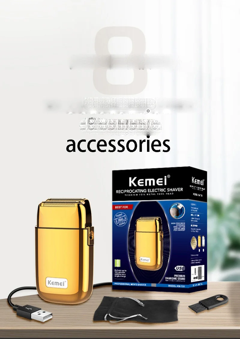 Аксессуары включены: для вашего удобства, kemei Finale поставляется со всеми аксессуарами, требуемыми для использования. В комплект входит бритва, крышка из фольги, usb-кабель, сумка для хранения, щетка для чистки.