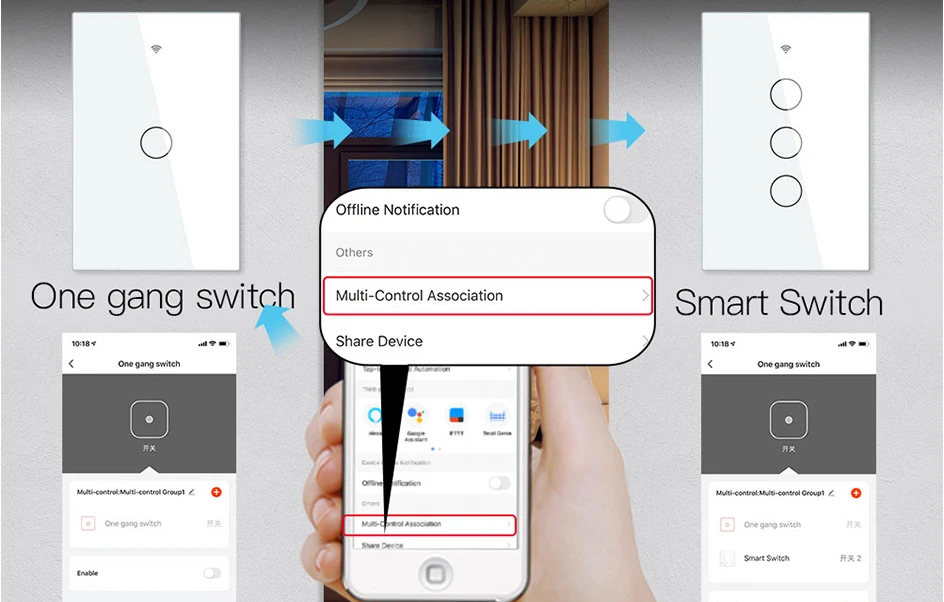(Note:You can multi-control associate of this switch to multiple different switches, but several gangs on one switch is not available, only one gang on one switch can be associated for multi-control.)
