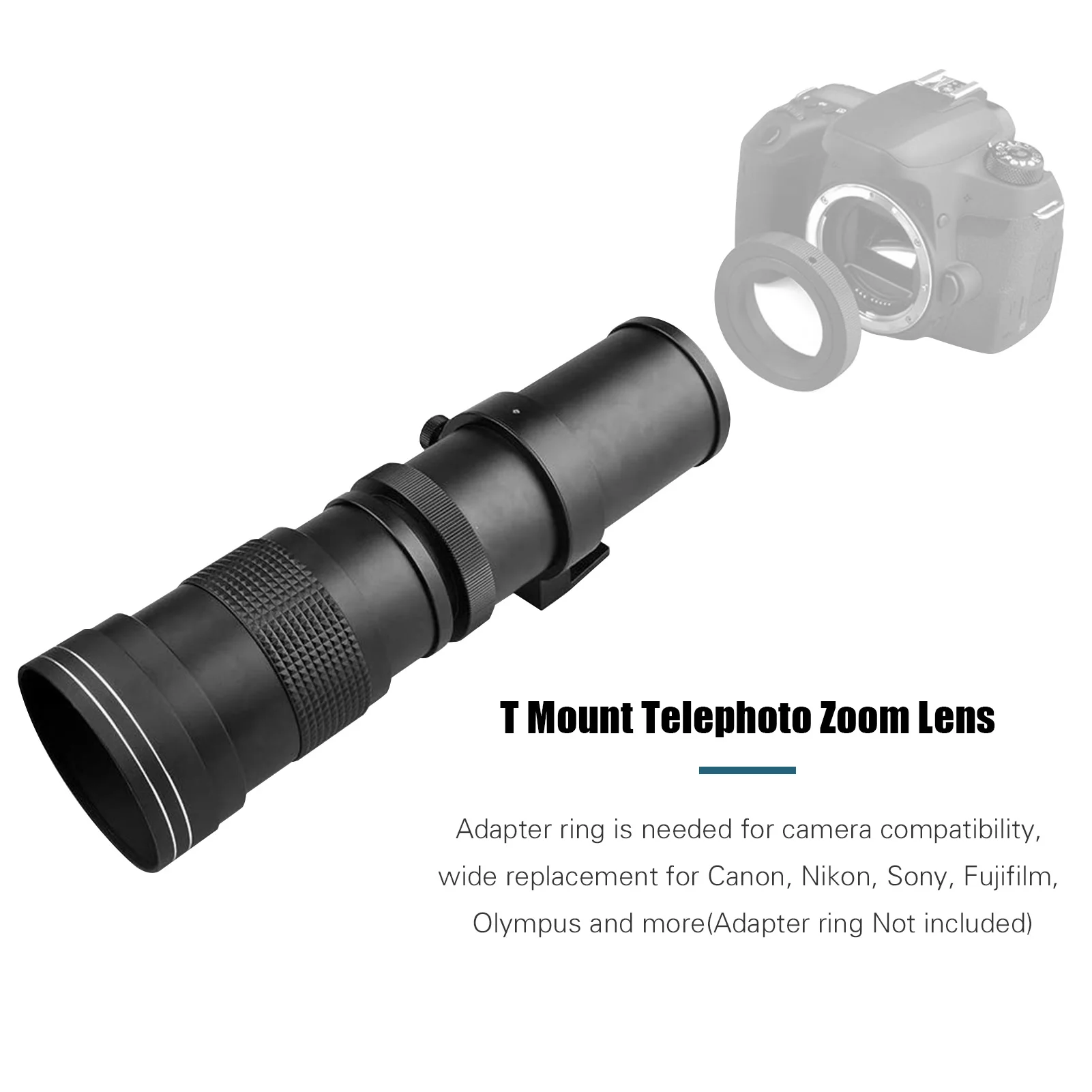 Широкая совместимость с Т-образным креплением:Мощные Сменные аксессуары для камер Canon Nikon Sony Fujifilm Olympus и многое другое, переходное кольцо необходимо для крепления.